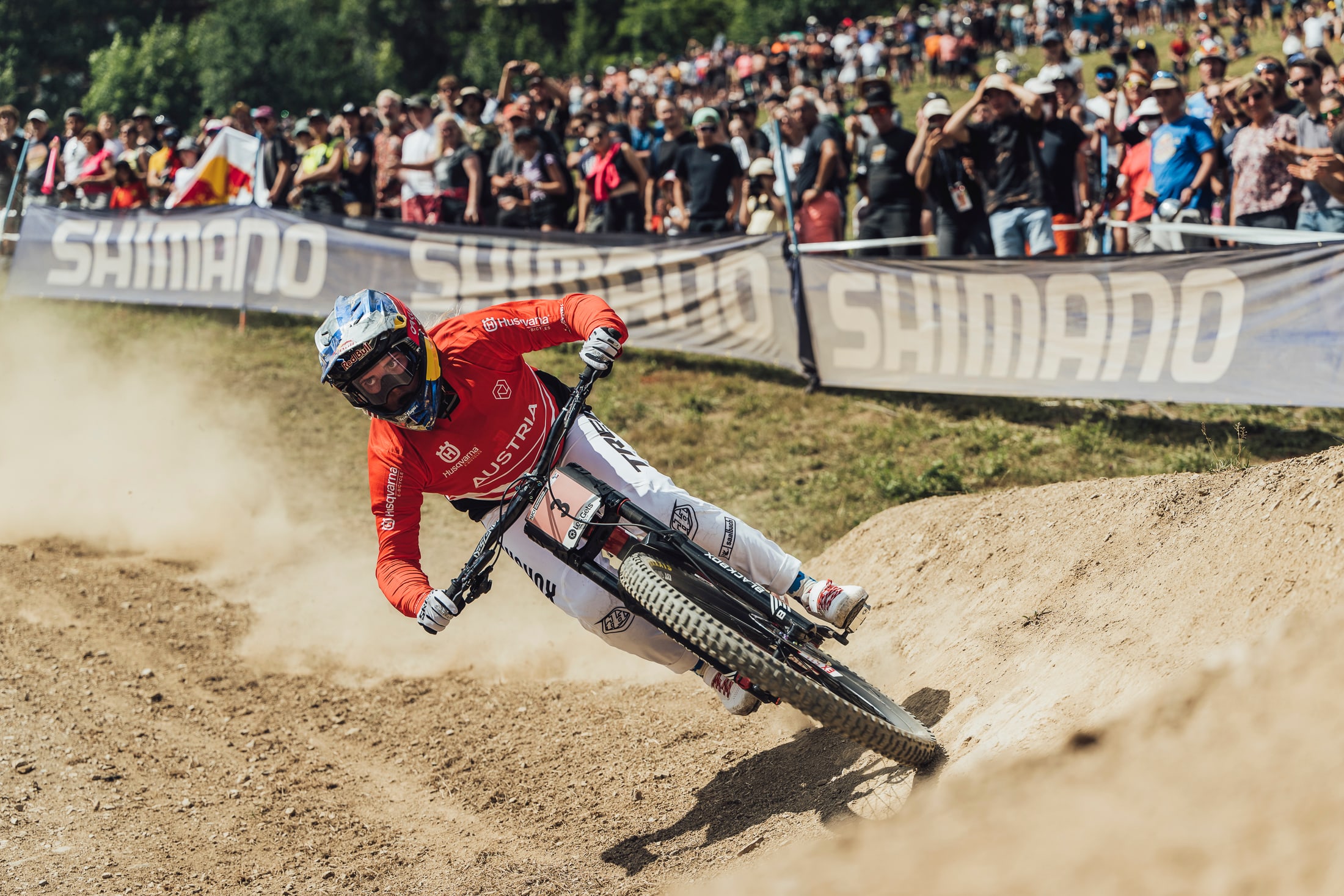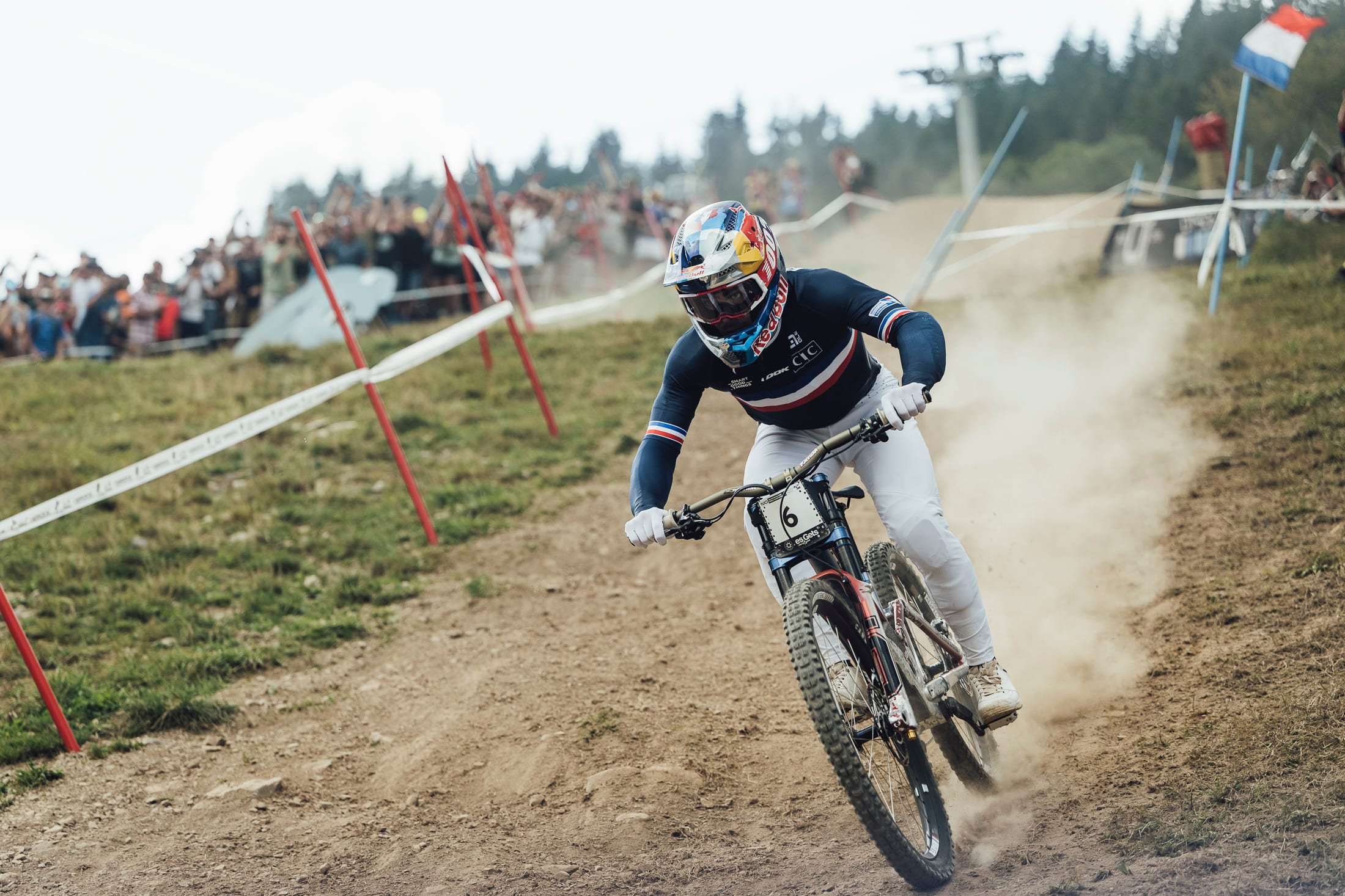 Loïc Bruni became the men's downhill world champion for the fifth time in front of an ecstatic home crowd that took celebrating a French victory to a new level. Bruni, starting fourth from last, took over the lead of the race from Australian Troy Brosnan with an electrifying run that was right on the limit. So committed was he that he nearly came off his bike on the second corner after he left the start gate. The Frenchman was more relaxed on the rest of the run and came in nearly 4s faster than Brosnan.
