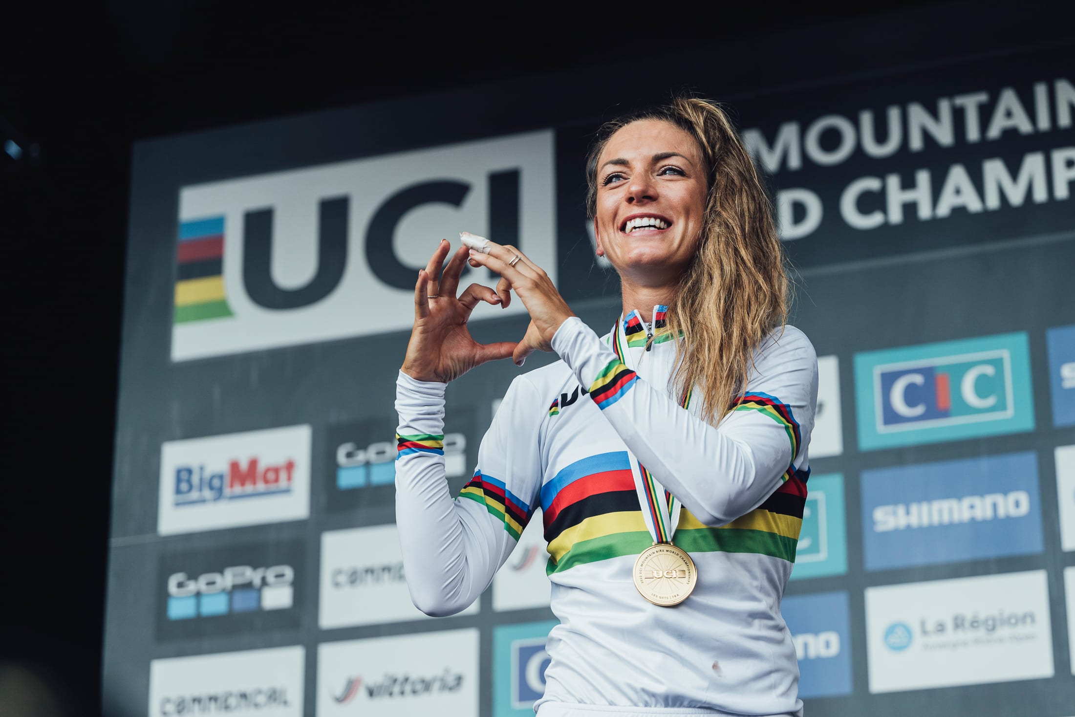 Pauline Ferrand-Prévot seals victory in the women's XCO race at the UCI Mountain Bike World Championships.
