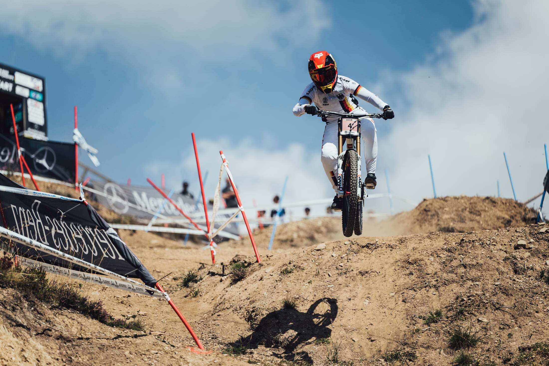 Downhill athletes have to wear national kit during qualification and finals, but they can wear whatever they want when they take to practice. Some go for a play on national colours, while others just use Worlds as an excuse to come out with some outlandish kit designs