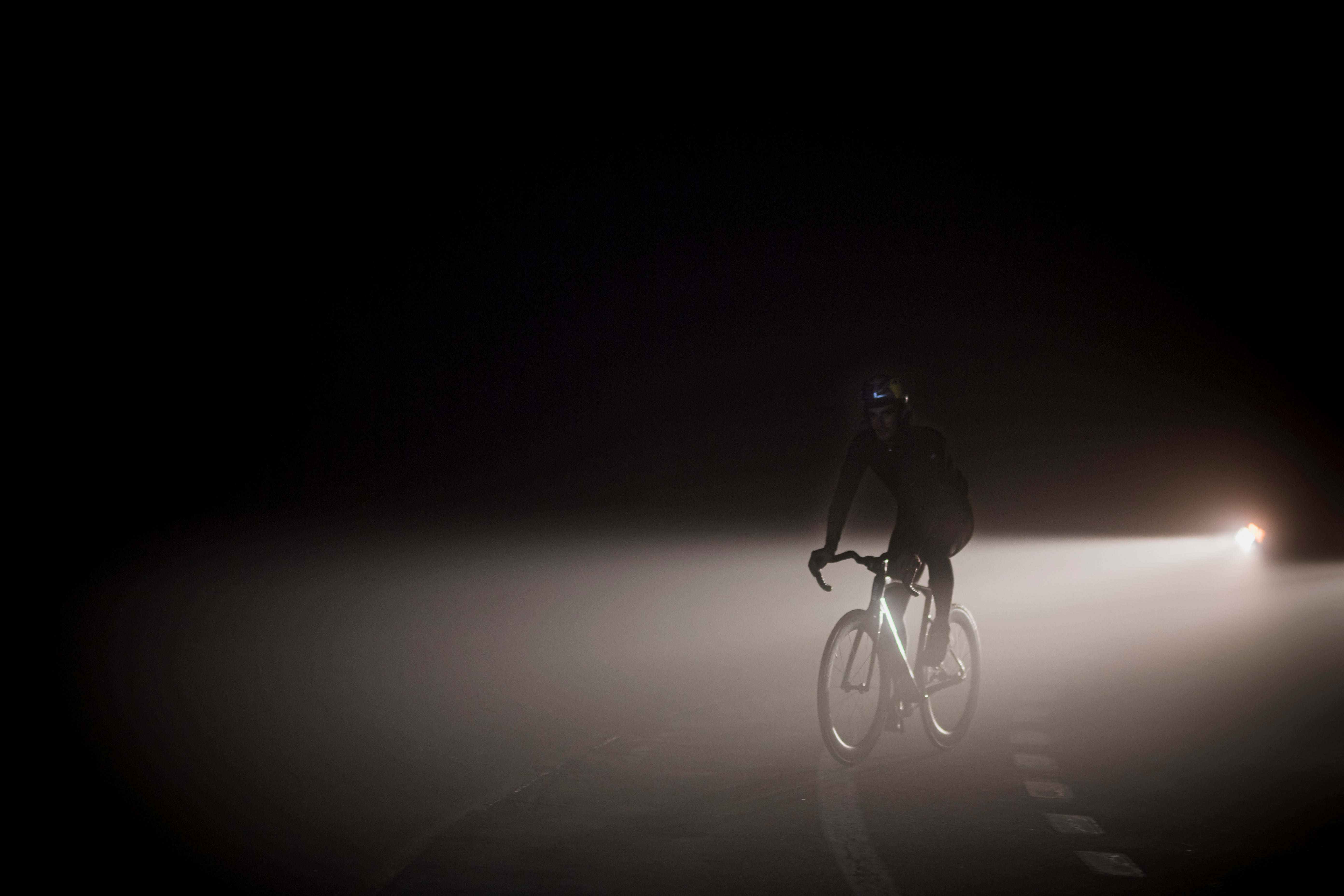But years of riding over mountain passes on his track bike have trained his body well, the muscle memory meaning that he could ride even when half delirious with tiredness. The sequence is ingrained: lift the rear wheel a few centimetres, stop the rotation, put the blocked wheel on the asphalt where the tyre leaves a smoking, rubber-smelling black trail. Immediately afterwards gravity accelerates the rider and the bike again and Seabase rides the wave of acceleration until it's time for the next skid and the next blocked rear wheel.