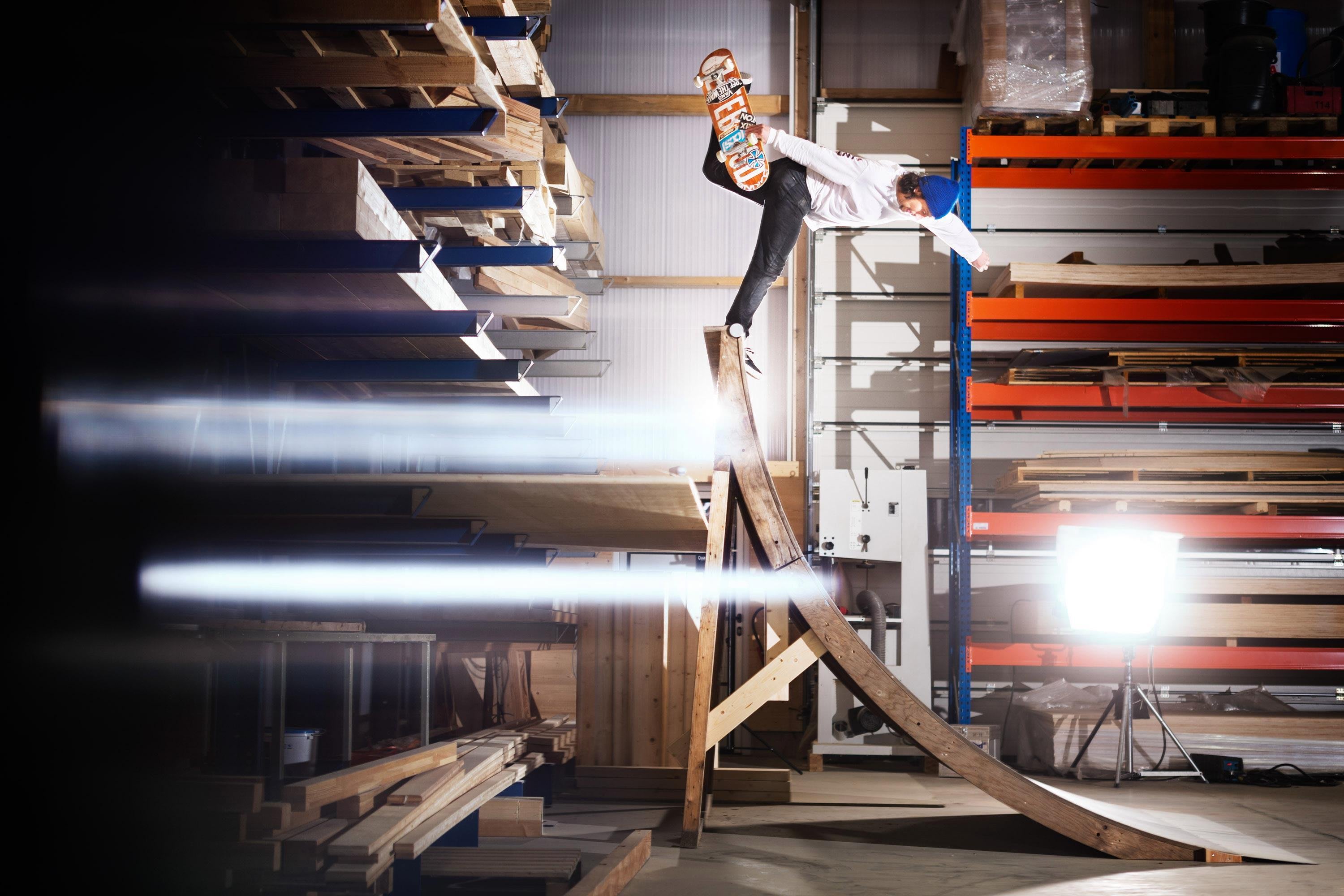 Schützi and the boys set up a skate course layout from top to bottom, starting with the mini ramp under the roof and cascading down through pallets and platforms to the (perfect) floor of the vast industrial hall itself.