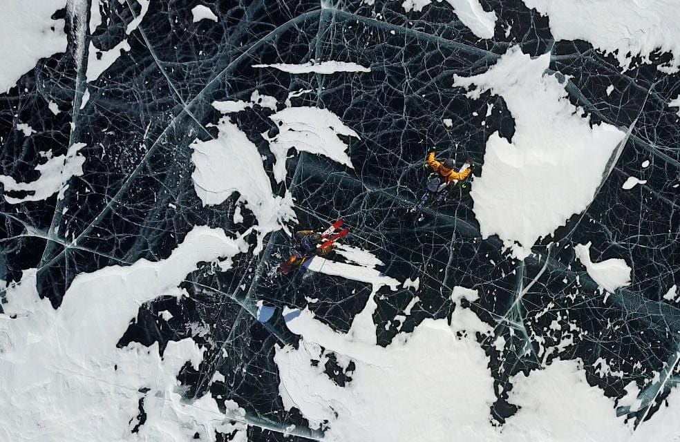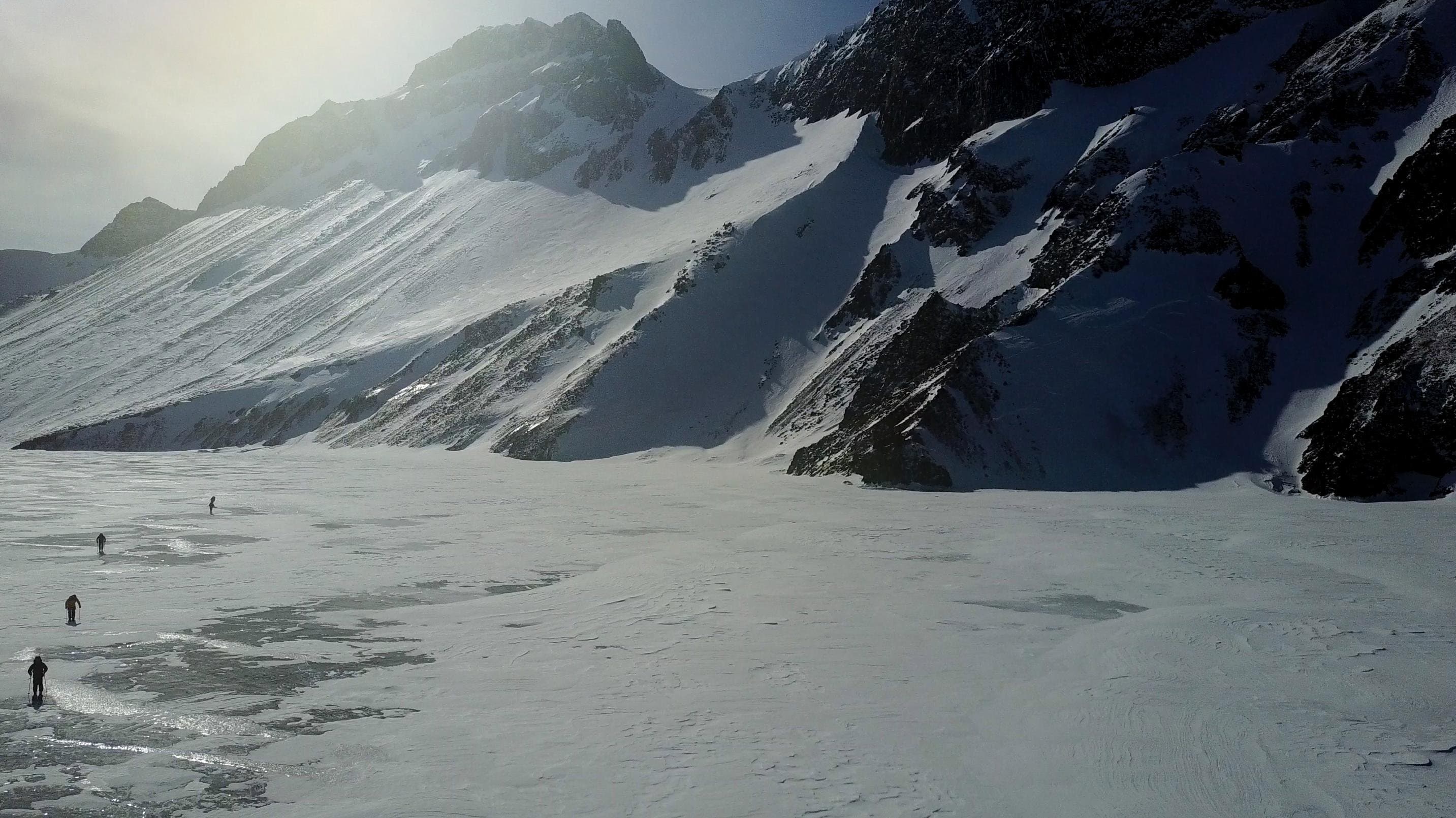 Por el lago helado Sam y Xavier eligieron unas líneas conservadoras. Iban por encima de hielos que tenían un metro de ancho hasta que encontraron un buen lugar.