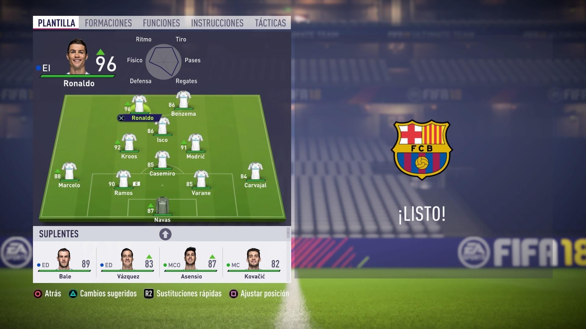 El resto del campo lo componen jugadores de nota alta, siendo los suplentes otro jugadores de primera línea que perfectamente podrían encajar en un once inicial. Por último, Keylor Navas se situará bajo palos con un 87 de nota media, siendo uno de los porteros con mayor puntuación dentro del juego.