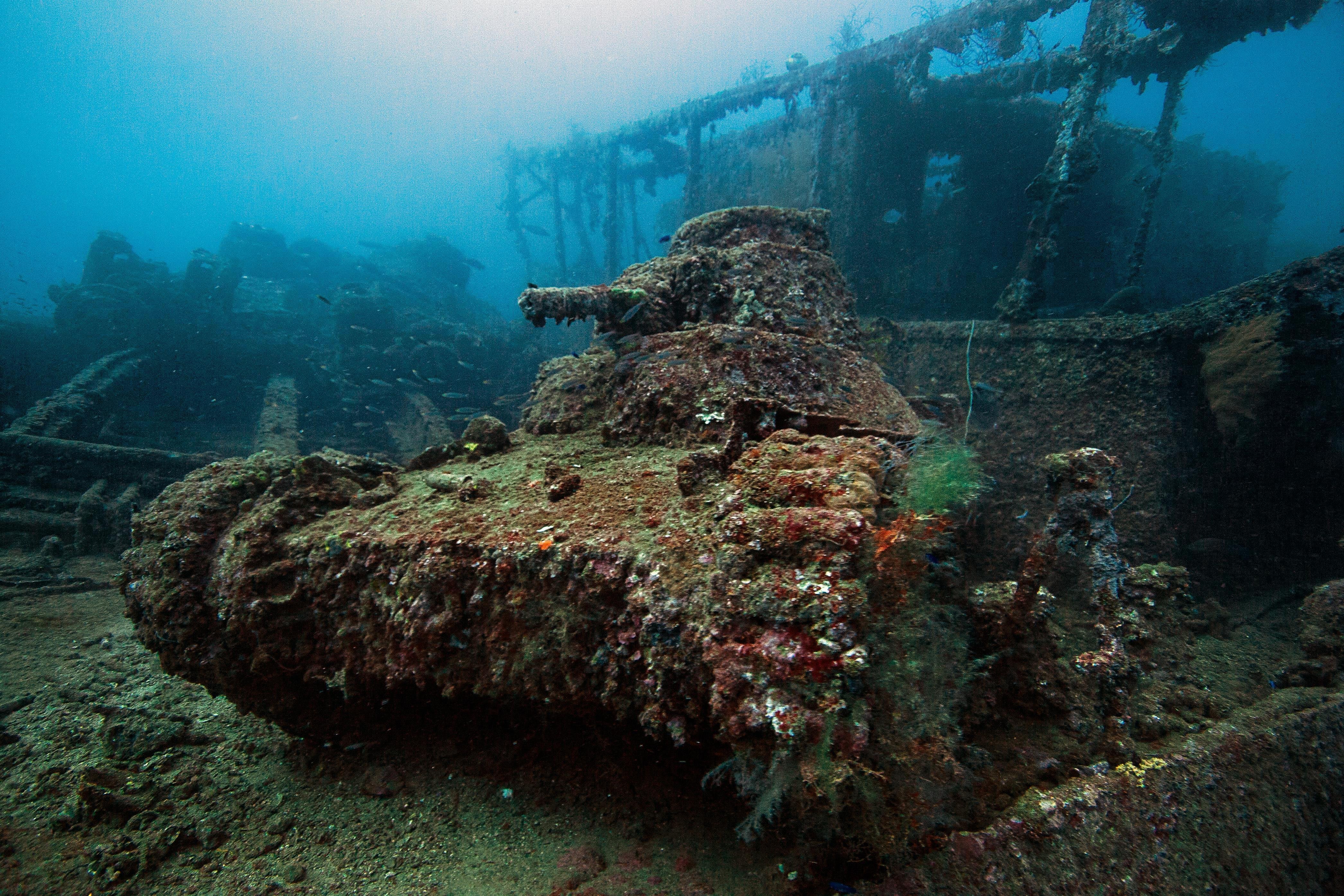 Una de sus atracciones más interesantes son los tanques japoneses Type 95 que aún yacen en cubierta. Además hay minas y torpedos así que ¡no toques nada!