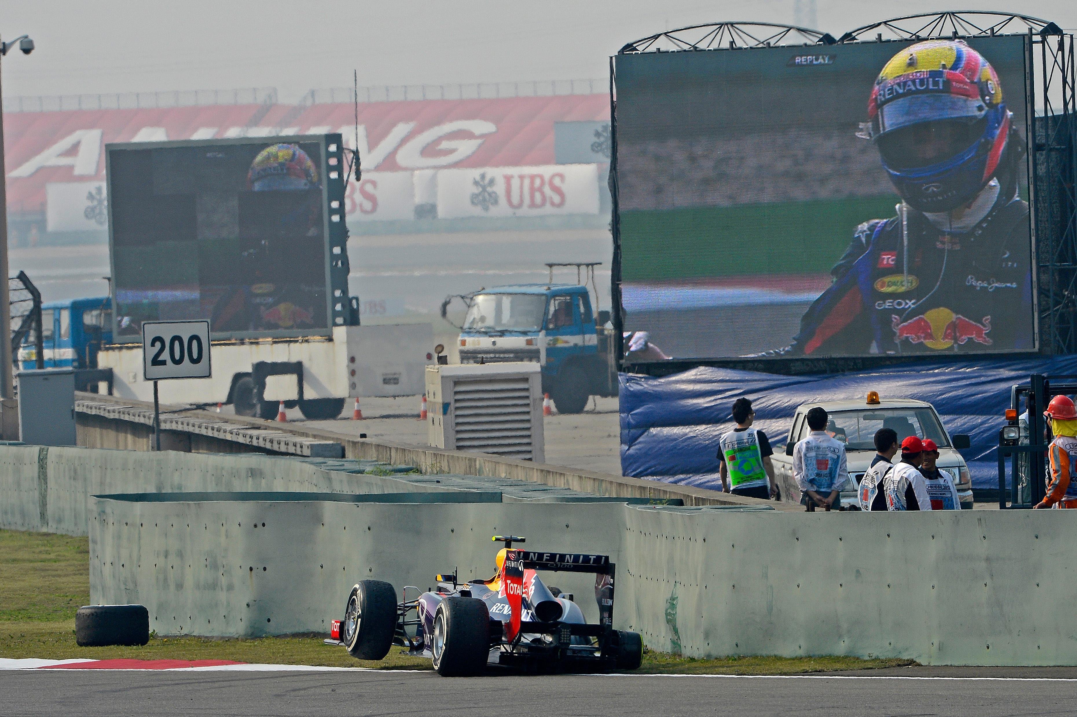 E’ stata invece una giornata meno felice per Mark Webber e Jean-Eric Vergne. Webber, partito dalla pitlane, è riuscito all’inizio a risalire velocemente il gruppo. Giunto a ridosso di Vergne, ha tentato un sorpasso all’interno ma ha finito per tamponare l’avversario, compromettendo la gara della Lotus e vedendosi costretto a un immediato giro ai box per cambiare musetto e montare gomme nuove. Al giro successivo, il 14esimo, la ruota posteriore destra della sua Red Bull si è staccata, costringendolo al ritiro.