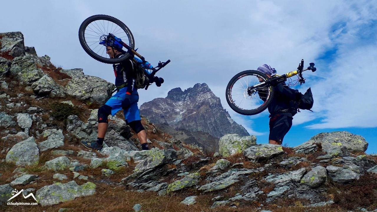 Quando Bobo esce per i suoi giri in MTB sono in media 1000 Km di dislivello positivo di portage, «ma ci sono stati momenti in cui ne abbiamo fatti anche 2000», ammette candidamente. Le bici sono quelle da trail-enduro, anche se ultimamente in molti cicloalpinisti si sono convertiti alle fat bike che sulle pietraie riescono a galleggiare meglio delle ruote normali, offrendo condizioni di sicurezza maggiori in discesa. «Nel cicloalpinismo, a differenza delle altre discipline a due ruote, non è tanto importante che il percorso sia interamente ciclabile perché l’ingrediente principale è il contesto “alpino”: spesso una parte della salita è effettuata sulle abbordabili pendenze di un sentiero o una di mulattiera, dove la bicicletta aiuta non poco nella progressione sia in termini di fatica sia di tempo impiegato. In questo caso l’ingombro e il peso del mezzo (11-15 Kg) complicano leggermente la progressione, ma se affrontato con una corretta tecnica questo costituisce soltanto una piccola fatica in più, che viene ampiamente ripagata dal divertimento della discesa».