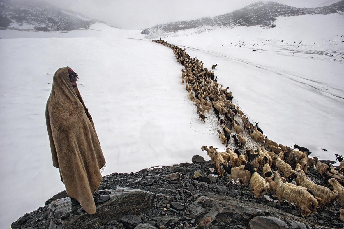 Il fotografo di Calcutta Sankar Sridhar ci mostra Saju, un pastore della tribù di Gaddi. Qui porta il suo gregge sul Thamsar Pass, a un'altitudine di 4.800 metri.