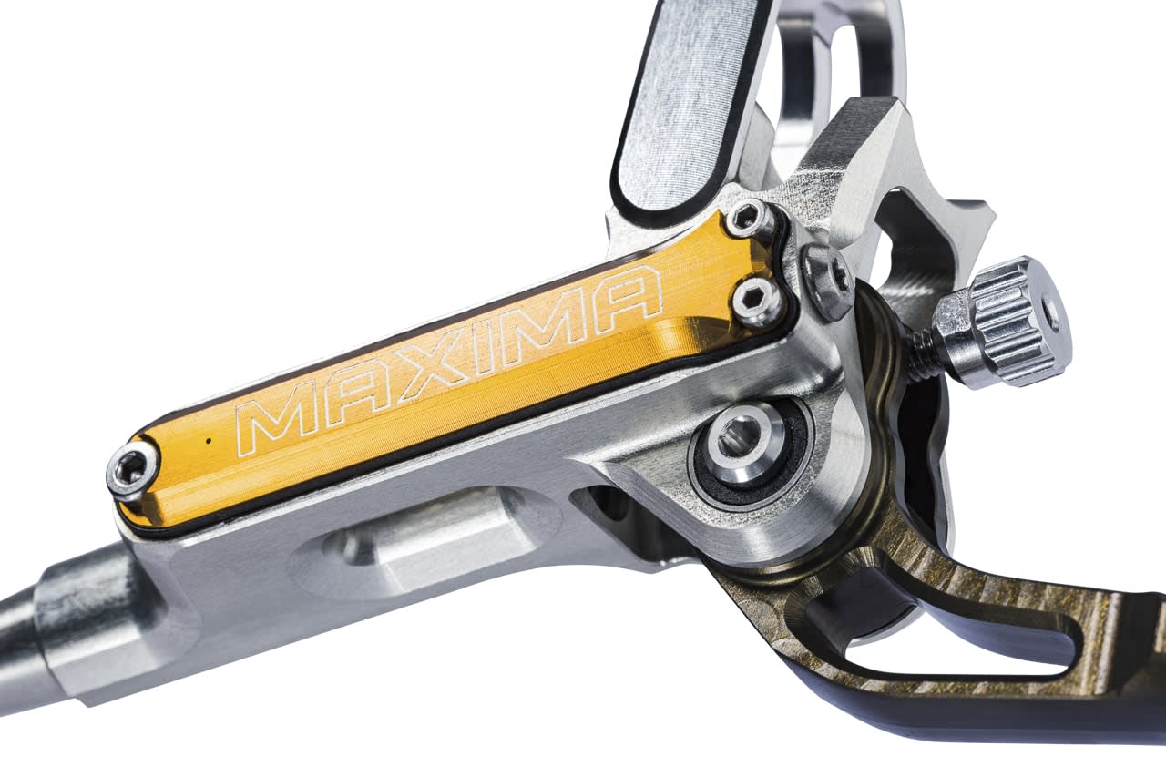 Se la vostra passione è il gravity ma non disdegnate allo stesso tempo di avere una mtb con peso leggero e massima affidabilità, l’upgrade perfetto è un impianto Trickstuff Maxima. Maxima è un componente dalla potenza extra ma un peso decisamente basso: nasce sulla base della leva Direttissima, ma ha un rapporto meccanico e idraulico più elevato così come una maggiore capacità termica. Il pistone principale di questo impianto è da 9 mm, mentre quello secondario è disponibile con una misura da 16 e 17 mm. Il corpo pinza a 4 pistoni ha più materiale per poter apportare più rigidità generale, ma il peso è di soli 301 grammi con la guaina Goodridge Steel Flex. Per la leva Maxima la distanza dal manubrio si regola con un piccolo rotore in maniera manuale: in questo modo Trickstuff ha fatto sì che al rider in fase di frenata venisse richiesta una forza minore, lasciando più spazio per un utilizzo migliore dell'avambraccio. L’aspetto positivo è che ogni impianto può essere personalizzato per il cliente, che può così scegliere buona parte dei componenti.