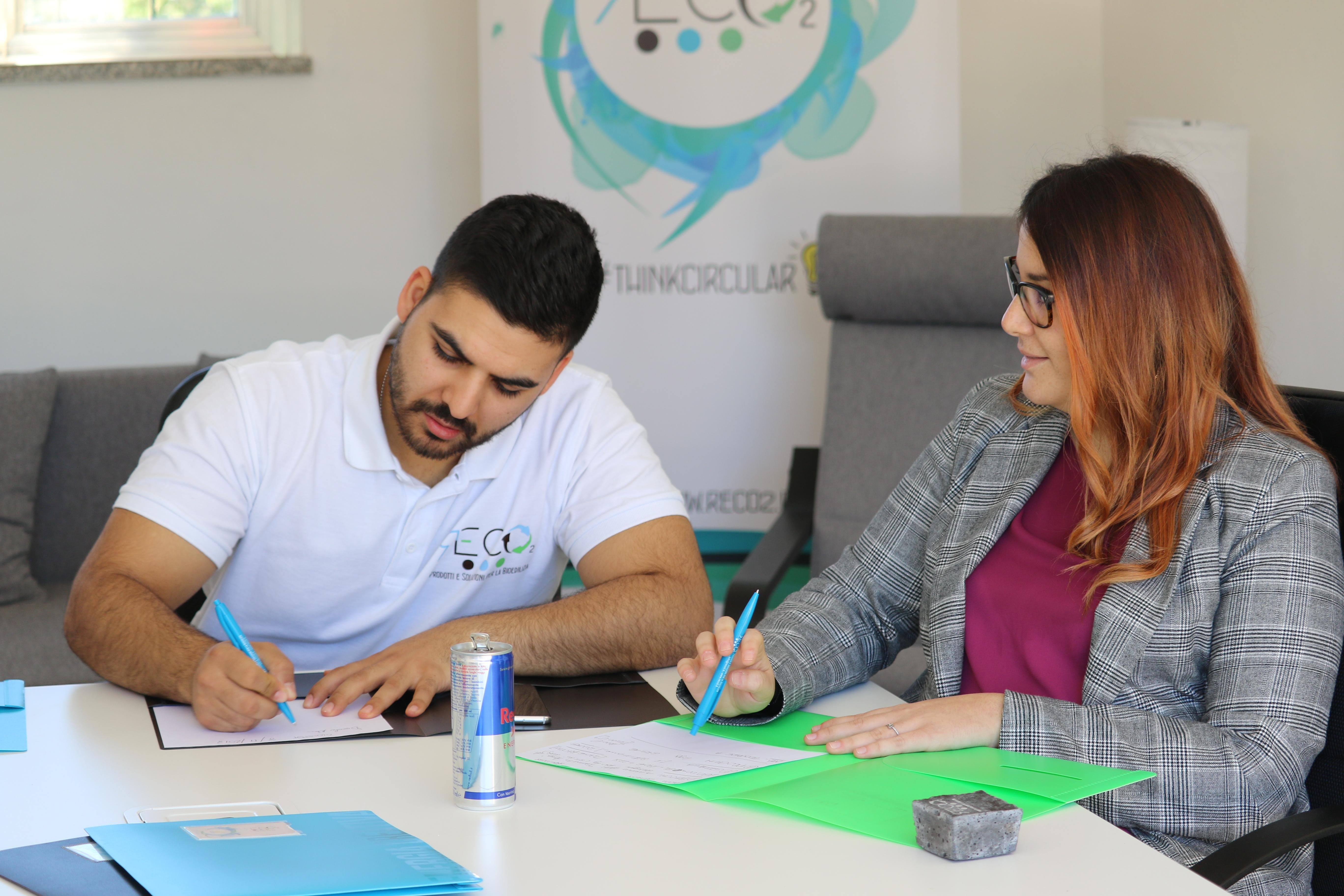 La scintilla scocca nel 2017. A giugno del 2018 Reco2 diventa ufficialmente una start-up: «Siamo partiti con l’idea di smaltire gli pneumatici fuori uso – racconta Désirée – ma poi abbiamo deciso di dedicarci alla bioedilizia: oggi recuperiamo i rifiuti delle aziende del territorio – metalli, vetro e pneumatici fuori uso – e li trasformiamo in prodotti per l’isolamento termoacustico e in pavimenti per interni ed esterni». I fondatori della start-up sono quattro: Désirée, il fratello Tommaso, Daniele Nora e Luca Spiridigliozzi, età media 26 anni. Il nome Reco2 è una sintesi delle varie anime della start-up: c’è la “R” dell’economia circolare (riciclo, riuso, riduzione), il richiamo all’ecologia (eco) e alle emissioni di anidride carbonica (co2), che Reco2 riesce ad abbattere in media dell’80%.