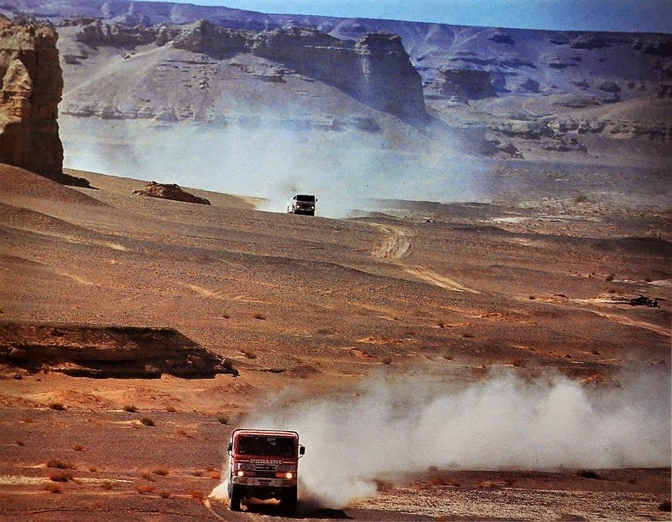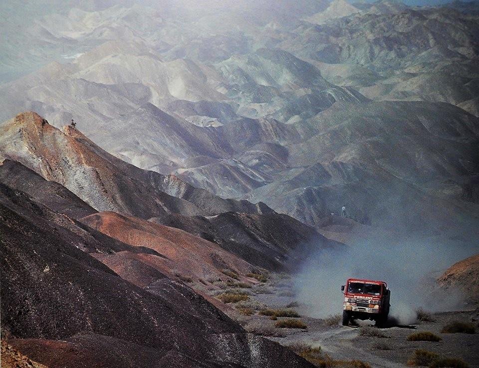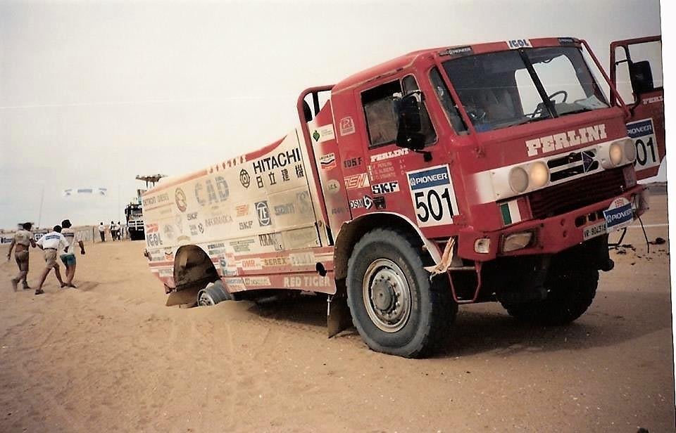 Chi corre la Dakar potrebbe avere paura di tutto e invece non ha paura di niente. O meglio, sa bene i rischi che corre e la paura se la dimentica per almeno due settimane. Per Franceso Perlini la paura più grande era quella delle moto, dover incontrare e schivare i motociclisti piantati in cima alle dune a causa delle moto pesanti che si insabbiavano. Dune che invece si beve alla grande un bestione dalla trazione integrale permanente con 3 differenziali bloccabili singolarmente. Quel Perlini 105F 4x4 era un mostro da 12.800 kg spinto da un motore Detroit Diesel 8V-92 da 12 litri, in grado di sviluppare una potenza di 550 CV e capace di arrivare a 150 km/h. I dati ufficiosi parlano di una velocità media raggiunta di 184 km/h, non lontano da quelle fatte segnare da Vatanen su Peugeot 405 Turbo prima e Citroën ZX poi. E hanno paura delle moto ferme…