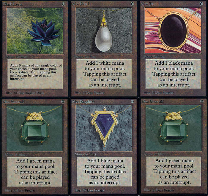 Mox Pearl, Mox Ruby, Mox Sapphire, Mox Jet e Mox Emerald sono le 5 carte artefatto che a costo 0 permettevano di bypassare la regola della singola terra per turno, permettendo giocate incredibili fin dalle prime fasi della partita. Tutte le cinque carte sono state illustrate da Dan Frazier e ognuna raffigura un gioiello del colore del mana prodotto.