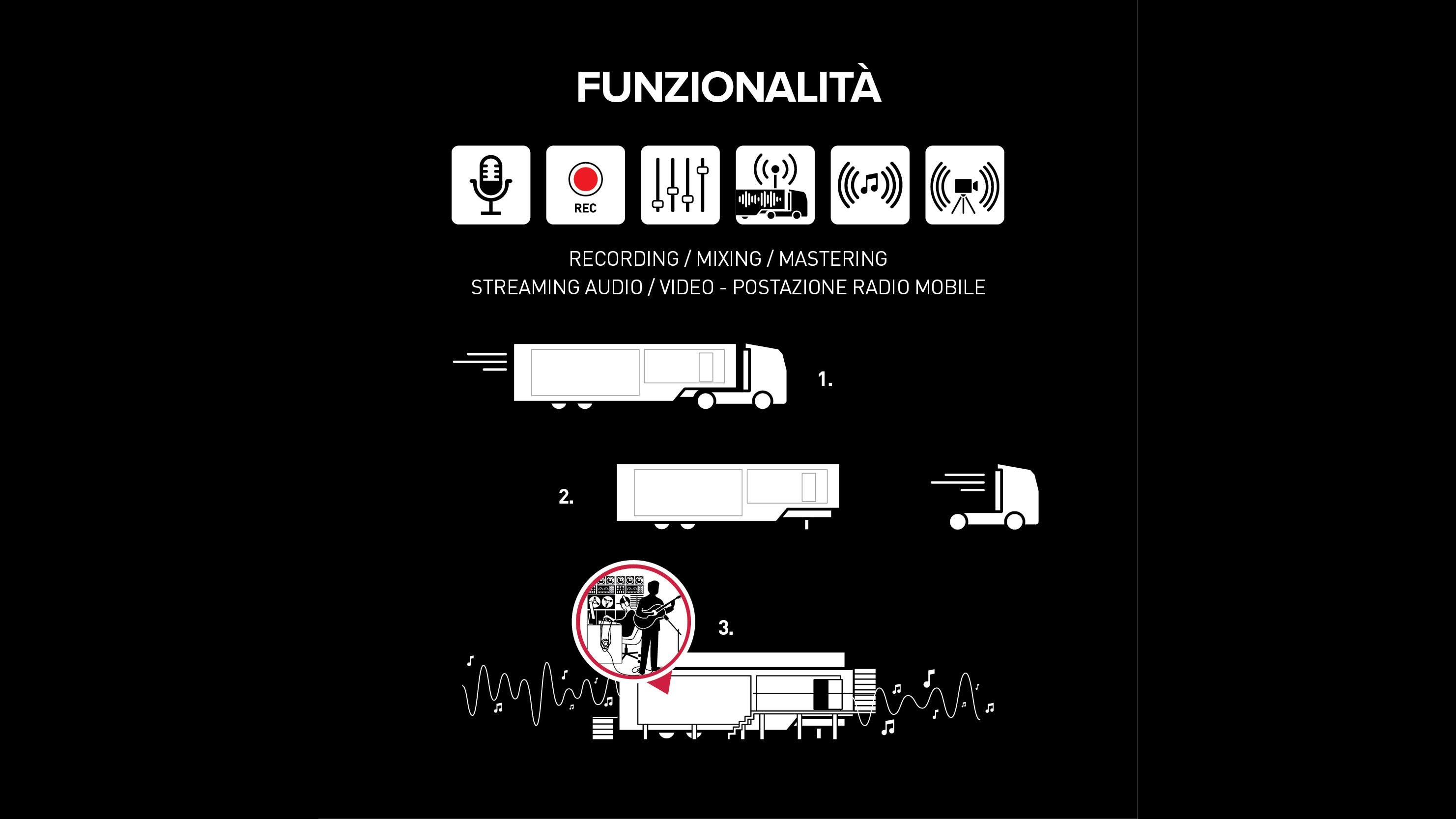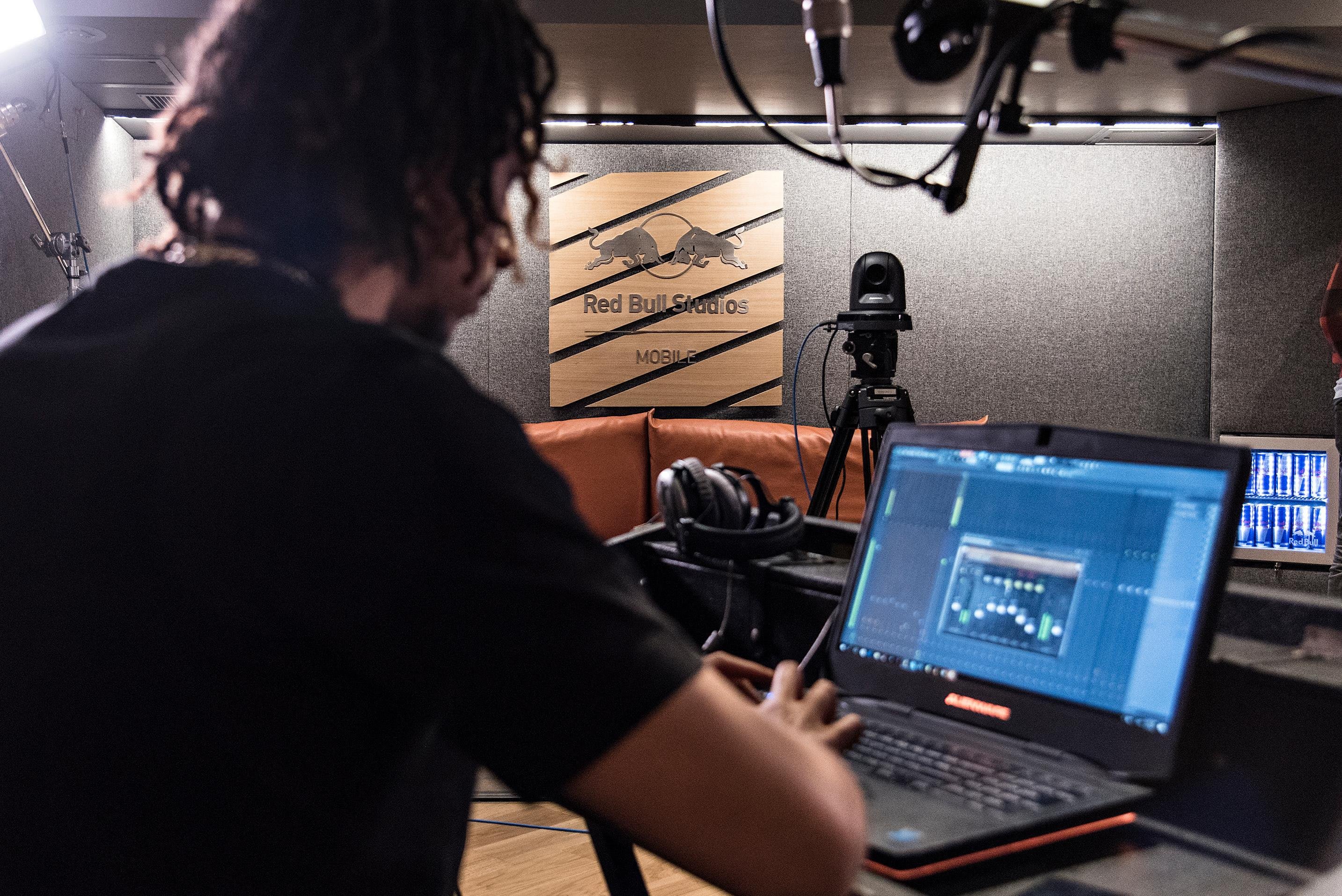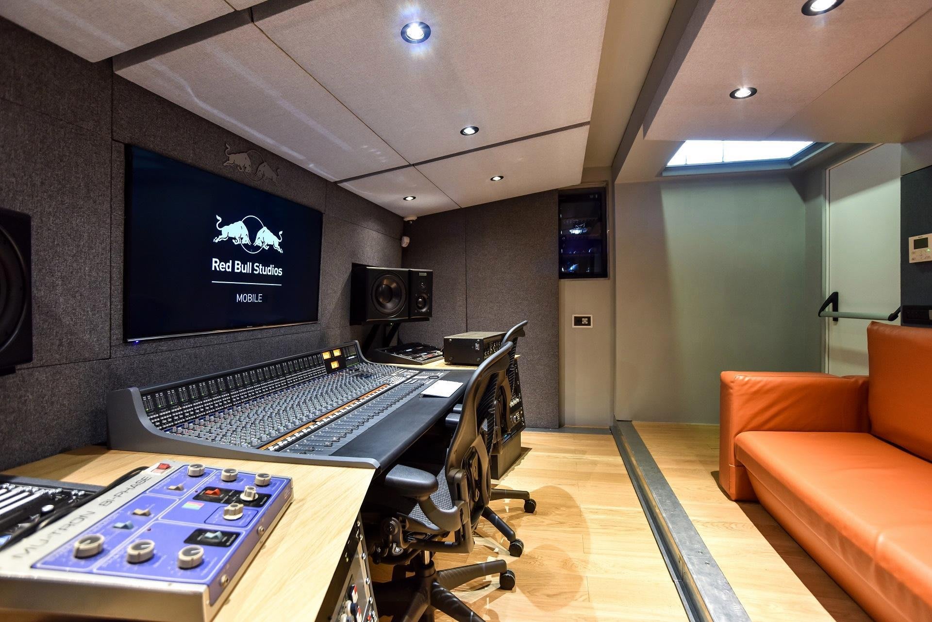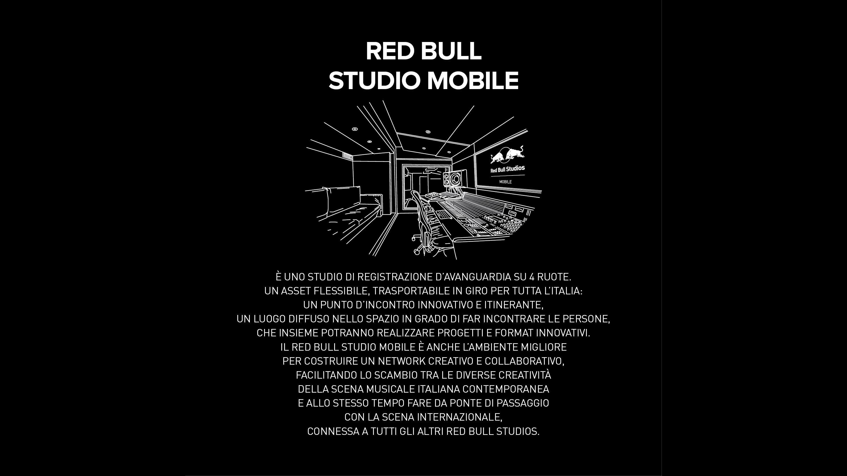 Il Red Bull Music Studio è uno studio di registrazione d’avanguardia su ruote. Al suo interno c’è tutto quello che deve esserci oggi in uno studio di registrazione di altissimo livello con tutte le strumentazioni audio e video che permettono di creare, sperimentare e registrare musica: una vera e propria presenza “mobile” della scena musicale italiana e internazionale. Il Red Bull Studio Mobile è un luogo diffuso nello spazio e trasportabile in giro per tutta l’Italia, un luogo d’incontro che facilita le collaborazioni tra artisti e musicisti, ideale per realizzare progetti e format innovativi, uno spazio perfetto anche per sperimentare. Il Red Bull Studio Mobile fa parte del network dei Red Bull Studios: 11 studi di registrazione presenti ad Amsterdam, Auckland, Città del Capo, Berlino, Los Angeles, Londra, New York, Parigi, San Paolo, Tokyo. Nel corso degli ultimi 10 anni il network è cresciuto sempre di più e solo nell’ultimo anno gli artisti che hanno suonato e registrato nei Red Bull Studios sono stati più di 1500, per una produzione di oltre 2000 tracce.