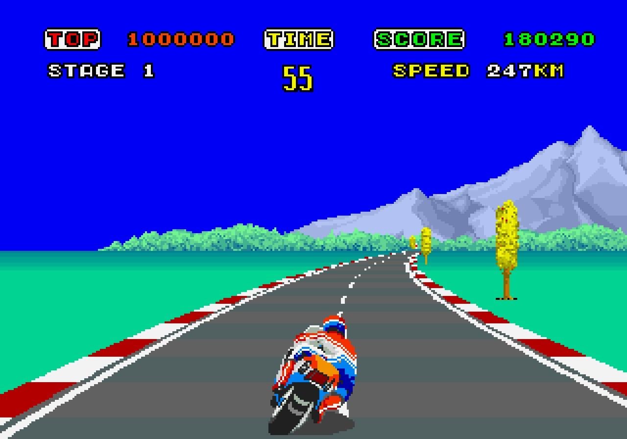 『バーチャファイター』や『アフターバーナー』、『シェンムー』といったSEGAを代表する名作ゲーム群を後に産み出す鈴木裕が1985年に手掛けたのがこの『ハングオン』だ。プレイヤーはバイクを操作しながら、制限時間内にチェックポイントを通過していく。