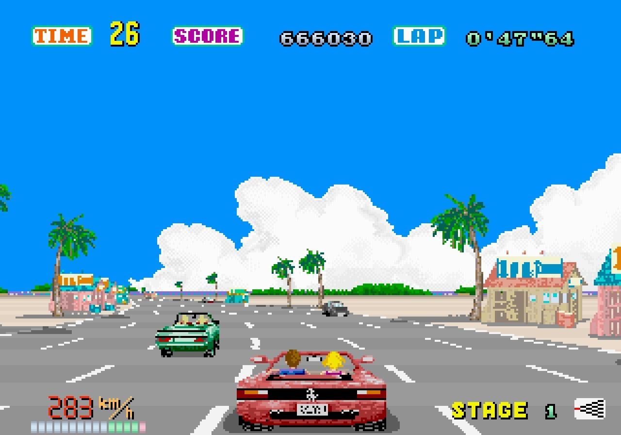 『ハングオン』を世に送り出した翌年、鈴木裕は『アウトラン』というもうひとつの傑作を産み出した。2輪よりも親しみやすい4輪をモチーフにしたこともあって、『ハングオン』よりもさらに広い層に受け入れられた本作は、『ハングオン』と同様のチェックポイント形式を踏襲したレーシングゲームだった。『ハングオン』でバイクに跨がっていたプレイヤーは、今度はフェラーリタイプのスポーツカーのハンドルを握ってプレイを楽しんだ。