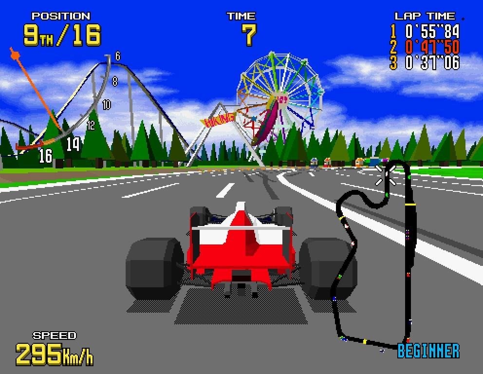 SEGAが発表した『バーチャレーシング』は、このリストの中では比較的影の薄いタイトルかもしれないが、従来のスプライト技術に代わってポリゴングラフィックを採用した初のアーケードレーシングゲームのひとつで、当時としては非常に画期的な作品だった。