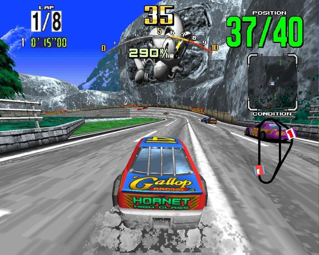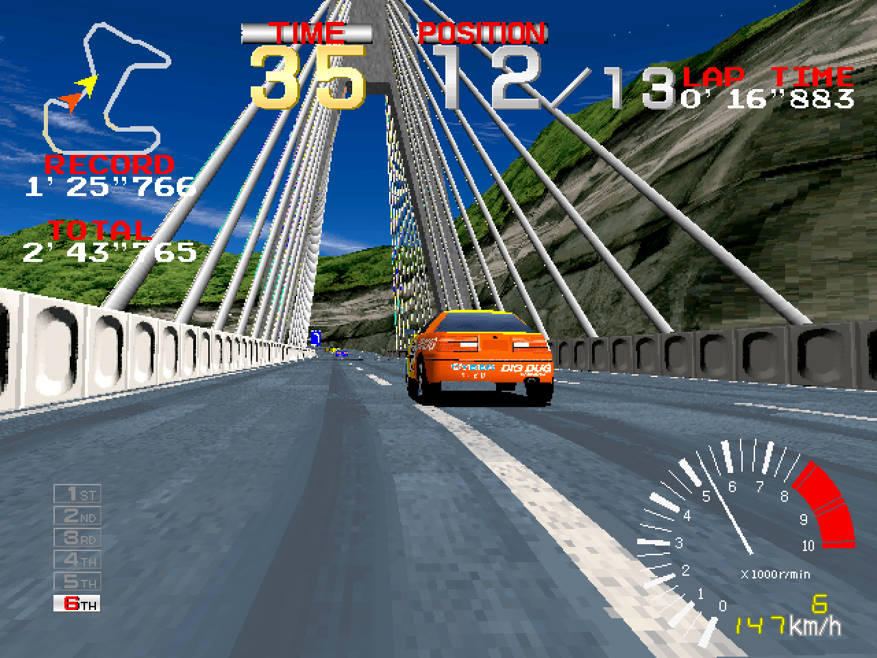 『バーチャレーシング』がポリゴングラフィックのレーシングゲームにおける基礎を築いたとするならば、この『デイトナUSA』はその土台上に造られたデカい家といったところだろうか。「デーイートォーナァァー」という印象的なテーマ曲(訳注:SEGAのサウンドクリエイター光吉猛修がヴォーカルを吹き込んだもの)がアーケード内に鳴り響くと誰もが振り向き、『バーチャレーシング』から更に進化したそのポリゴングラフィックも多くの人たちを魅了した。