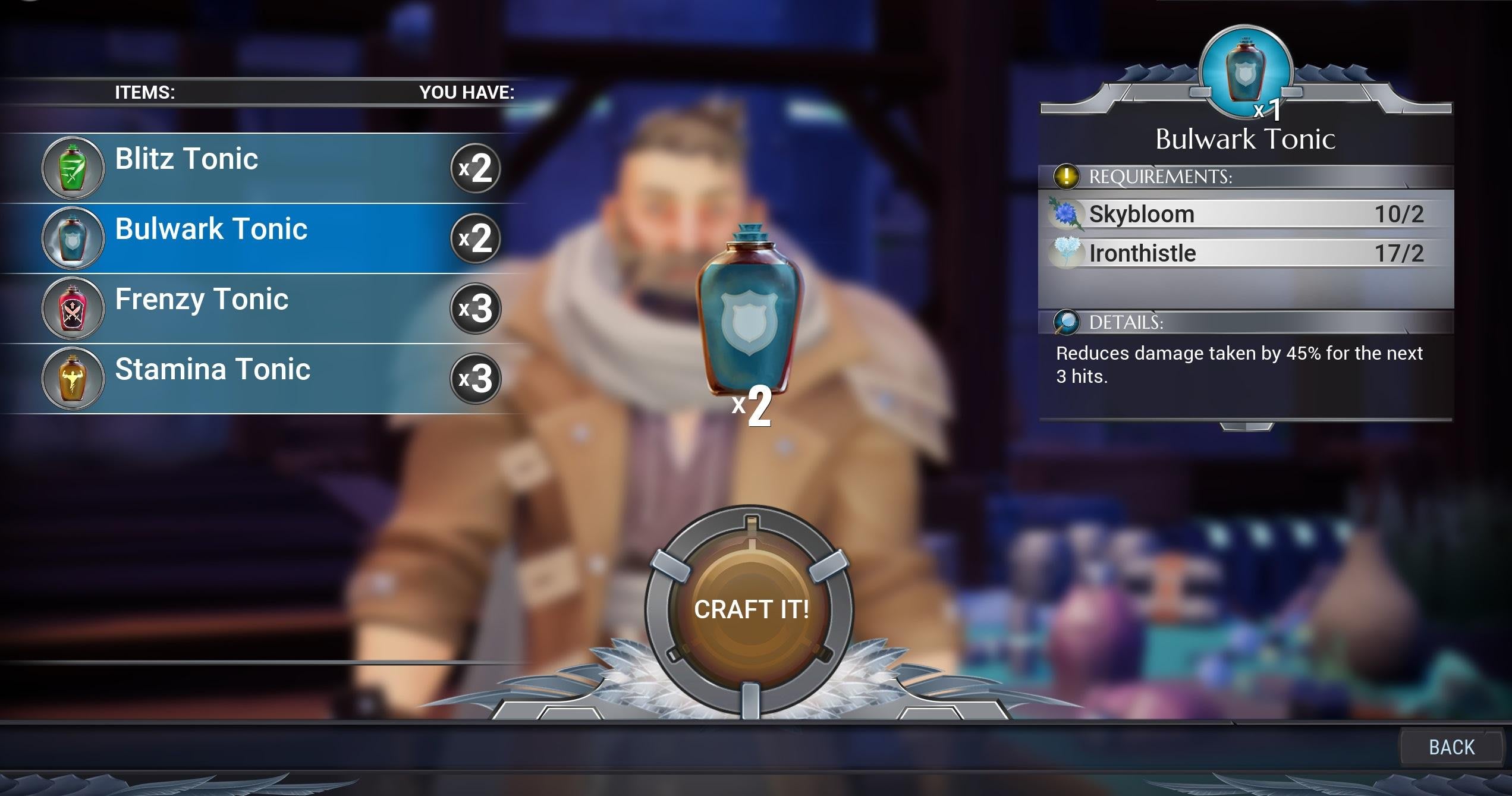 たとえば、《Skybloom》や《Ironthistle》のような素材を集めてラムズゲートにいるMarkus Boehrに依頼すれば《Bulwark Tonic》をクラフトしてもらえる。