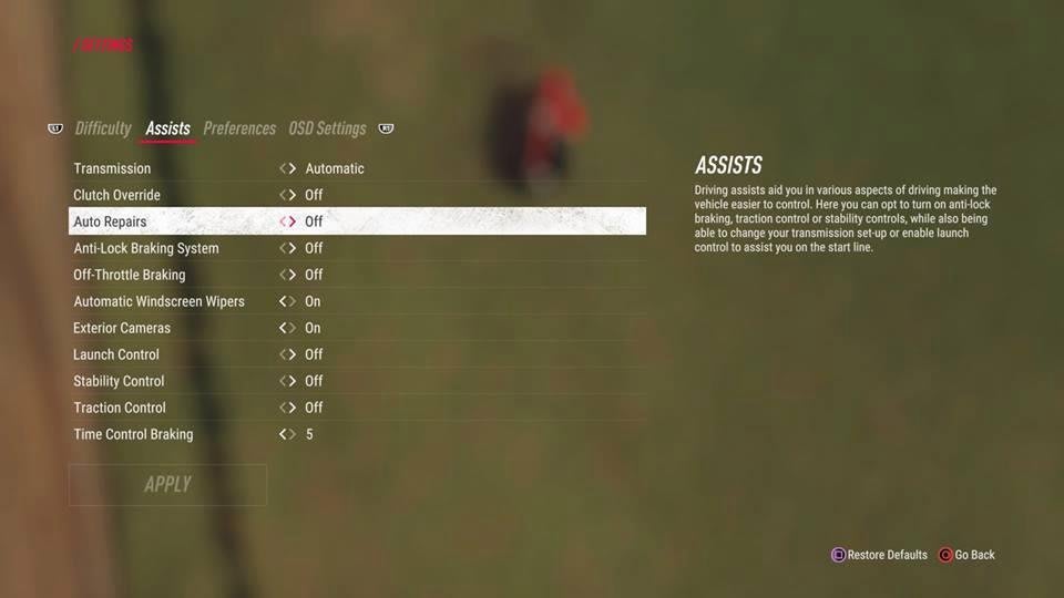 次に《難易度》の右隣《アシスト》へ入ろう。ここには、“トランスミッション”、“アンチロックブレーキングシステム”、“トラクションコントロール”、“スタビリティーコントロール” など様々なオプションが用意されている。