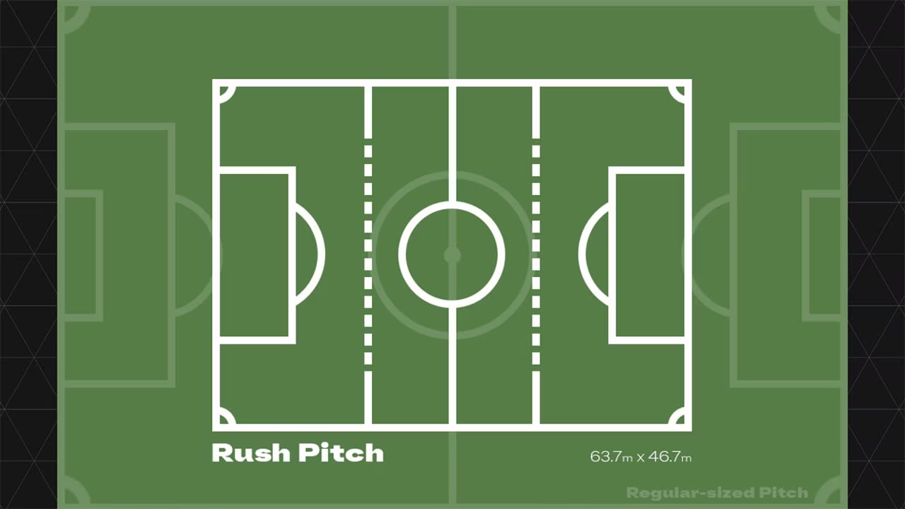 『EA Sports FC 25』のもうひとつの目玉と言える新機能が《Rush》だ。このモードはクラブ、Ultimate Team、キャリアモード、キックオフで使用できる。《Rush》は狭いピッチでの5対5で、各チームはゴールキーパー1人とフィールドプレイヤー4人で構成される。ゴールサイズは通常と同じだが、ピッチは自陣・敵陣・ニュートラルの3ゾーンになる。