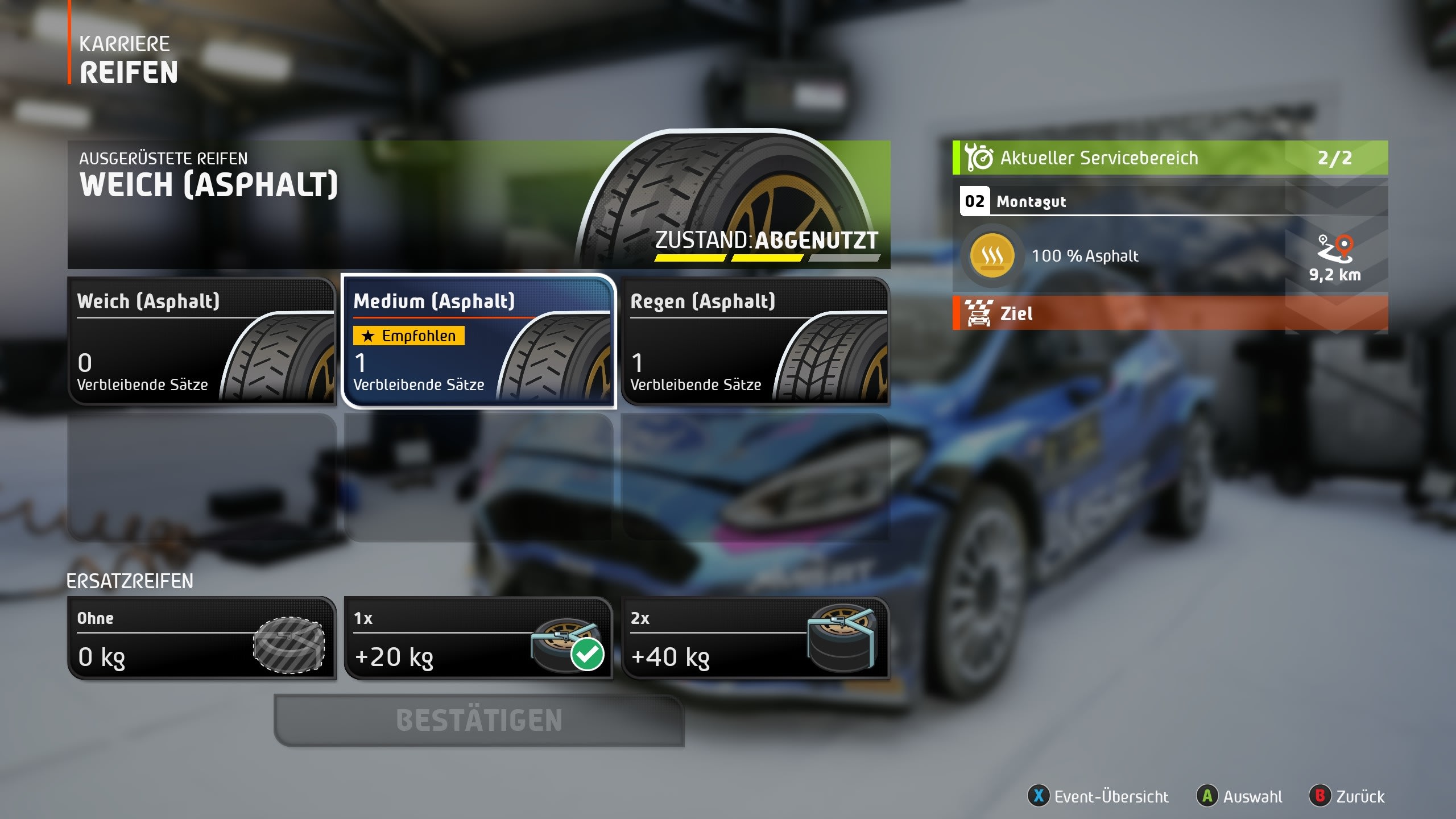 シェイクダウンを終えたら、ステージごとに追加のタイヤセットも準備しよう。また、スペアタイヤの本数も0〜2本の間で選ぶことができる。スペアタイヤはWRCカーの重量とスピードに影響する。