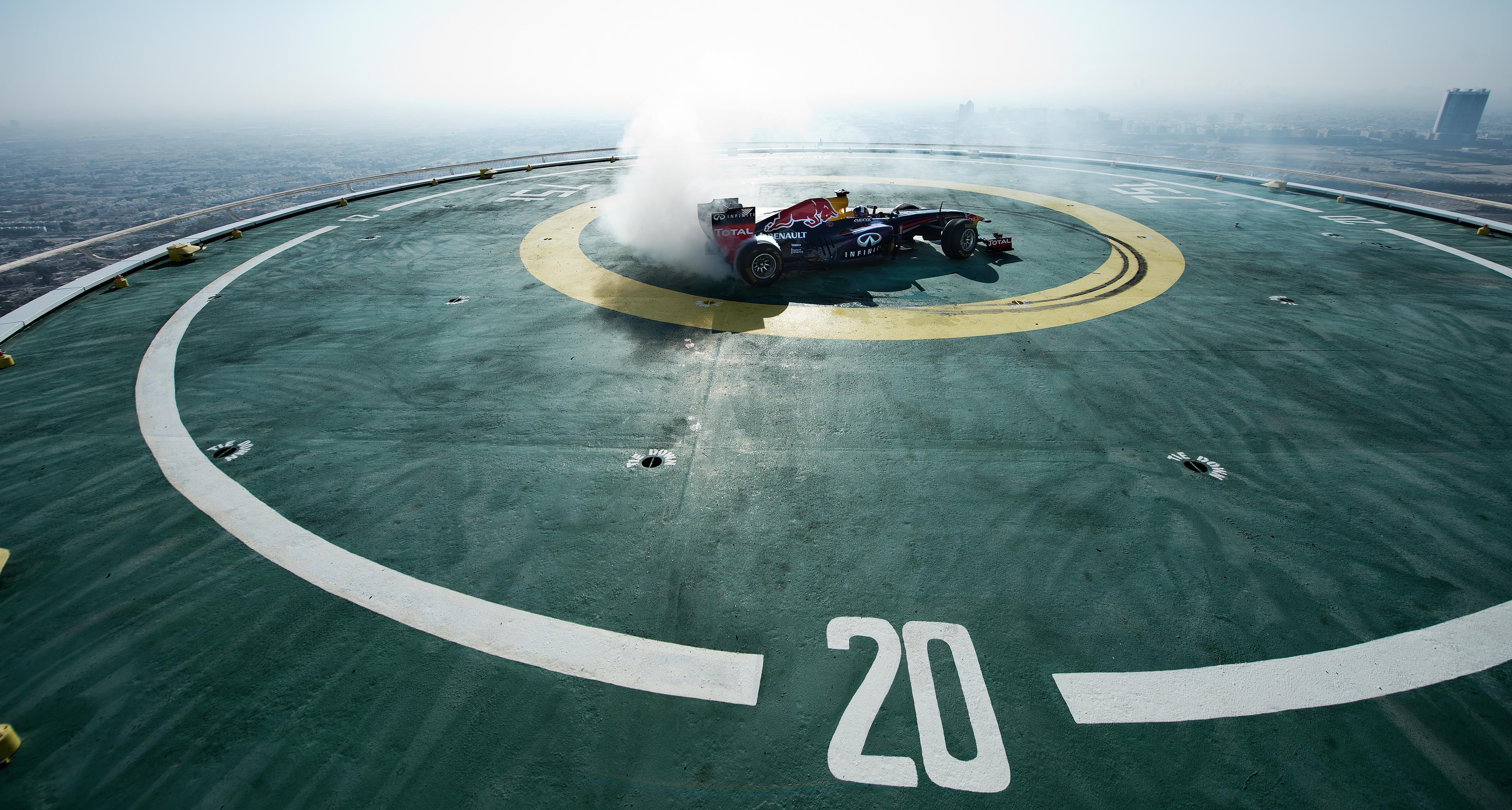 750馬力を誇る2013シーズンのチャンピオンマシン、RB9でドーナッツターンを披露しようというところまでは理解できるが、それを海抜210m地点で行おうと言うのだ。