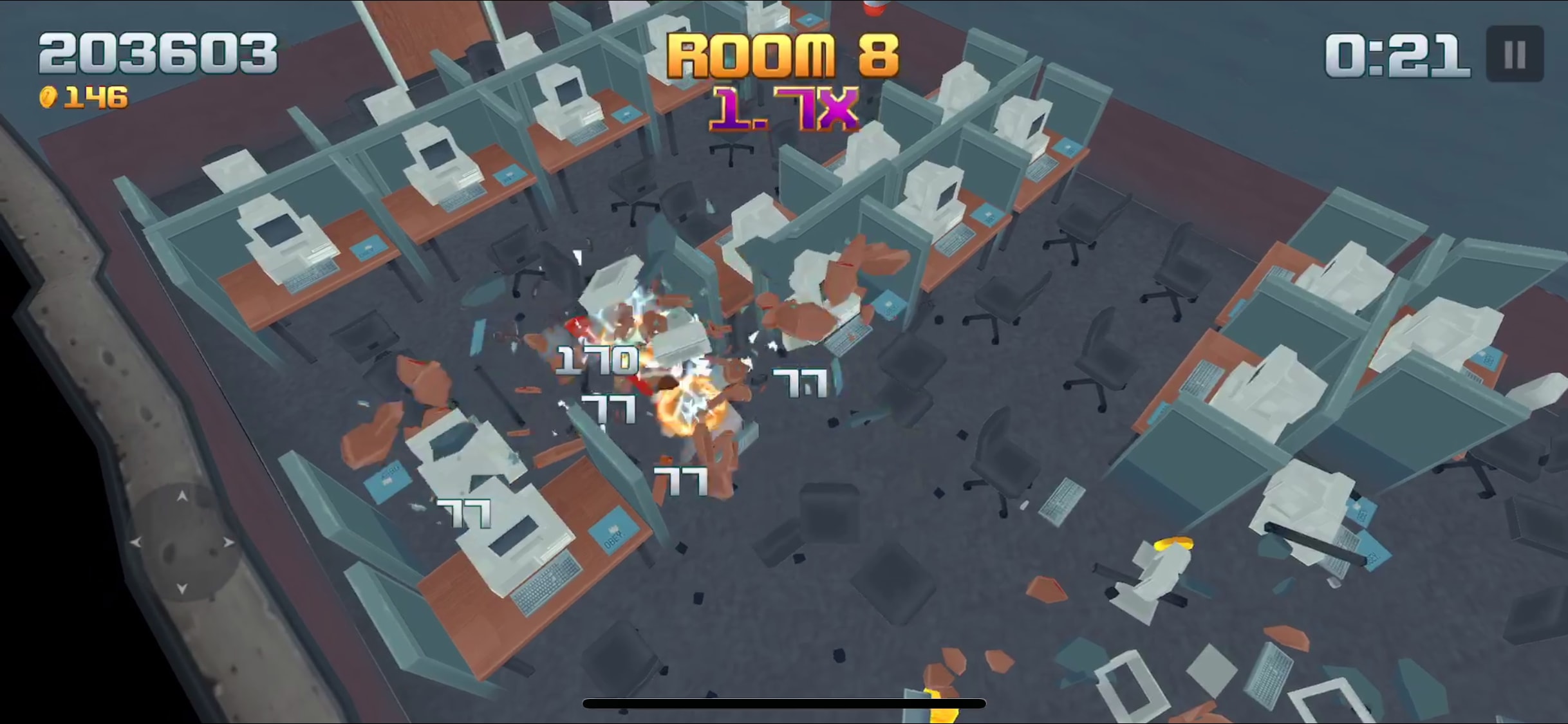 なお、オフィス内に落ちているウォーターサーバーを破壊すれば制限時間が4秒延長。また、消火器を破壊すれば爆風を放ち、巻き込んだ障害物をまとめて破壊することもできる。