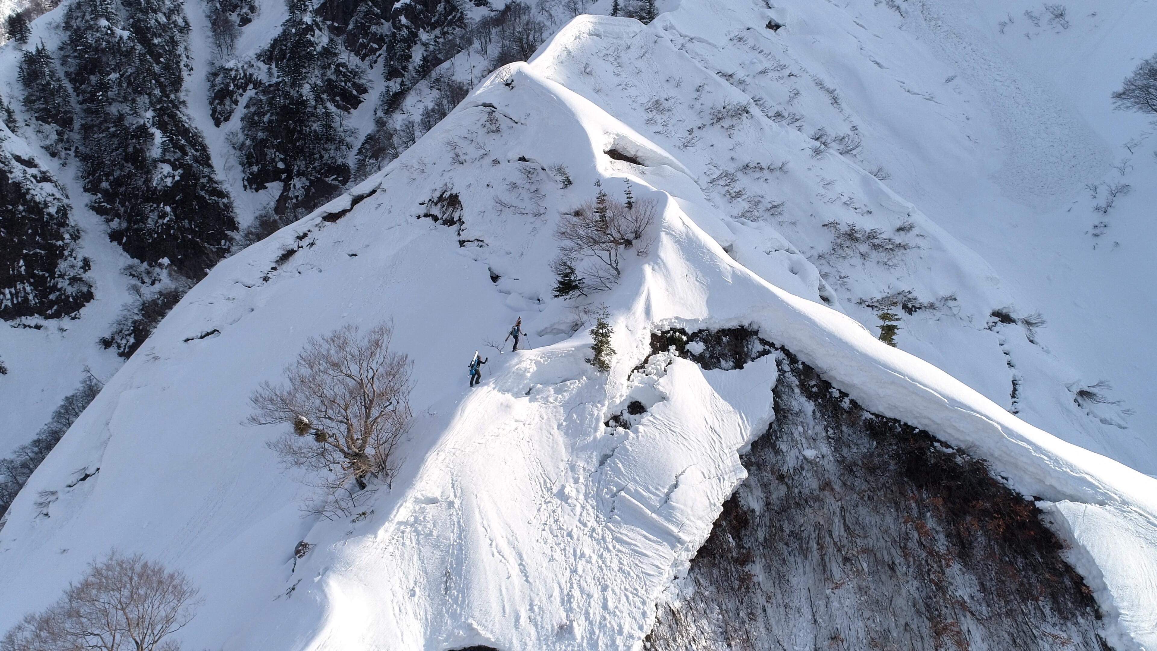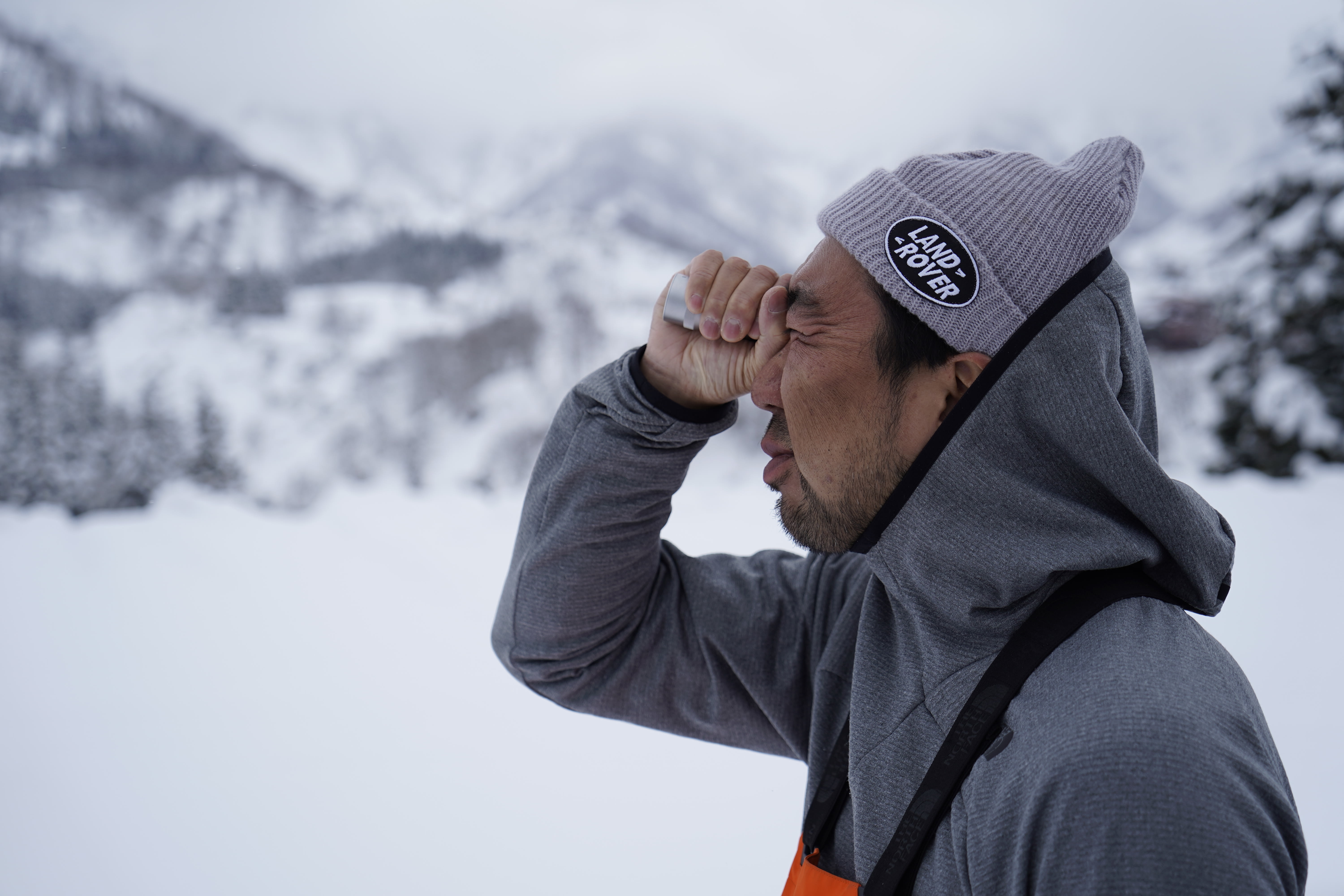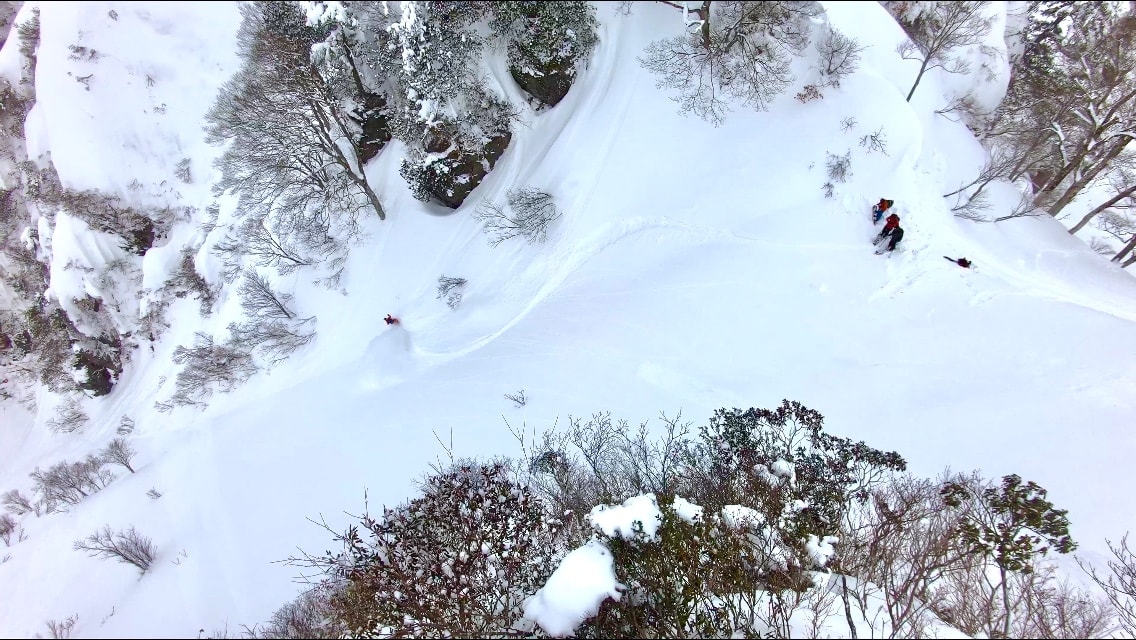 日の光が入り込み、雪質が悪くなる前に滑りたい。素早く、そして確実に準備をする。同行しているビデオグラファーは少し高い位置に移動し、俯瞰で映像を撮る。アシストガイドは万が一に備えた準備をする。ライダー3名は誰が最初に滑るかをジャンケンで決めた。麓のカメラマン、ドローンパイロットも準備が整った。