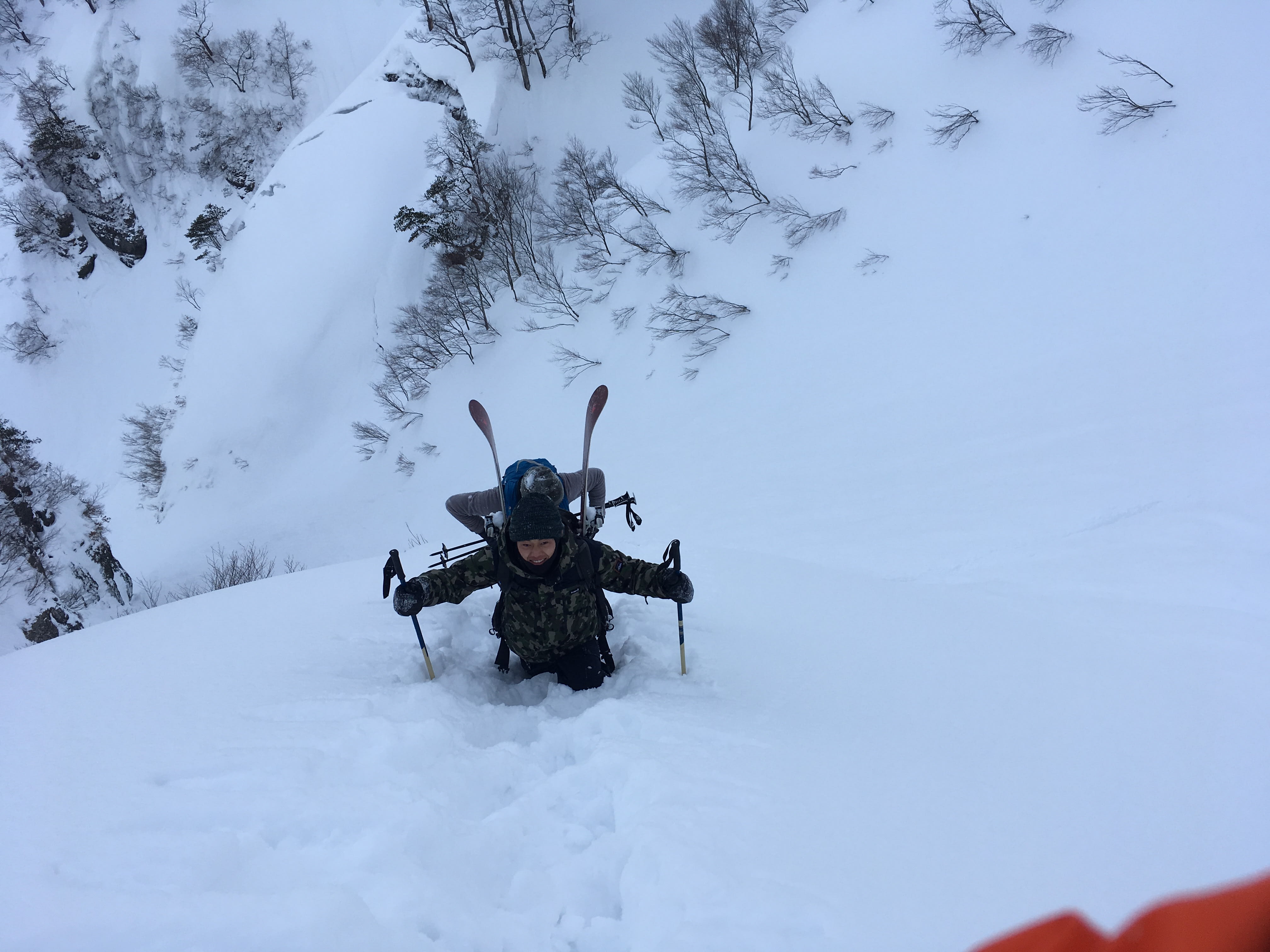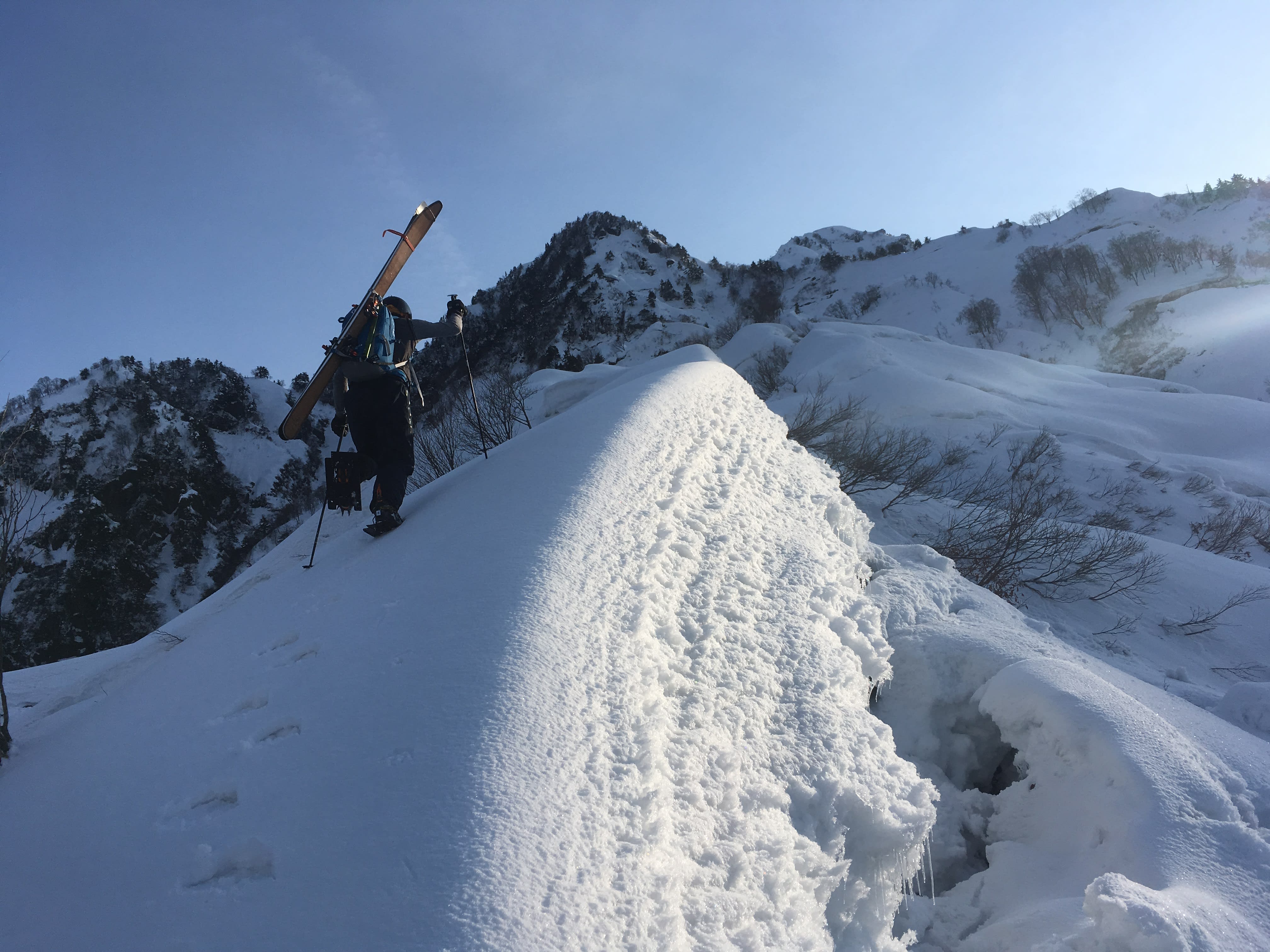 急斜面は山岳滑降の一番の魅力だと感じている。なかでも急峻な谷間に雪がたまる場所は魅力的だ。そして、八海山クーロワール。いつかは滑らなければと思い続けた場所だ。クーロワールとは山腹を上下に走る岩溝のこと。この岩溝に雪がたまり滑ることができるようになるのはシーズンの中旬のみで、2月末になると雪は悪くなり、岩溝内で雪崩が起きるため滑ることができなくなる。ほんの一瞬のチャンスしかないのが、八海山クーロワールなのだ。