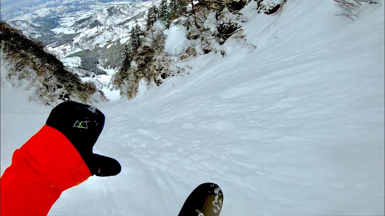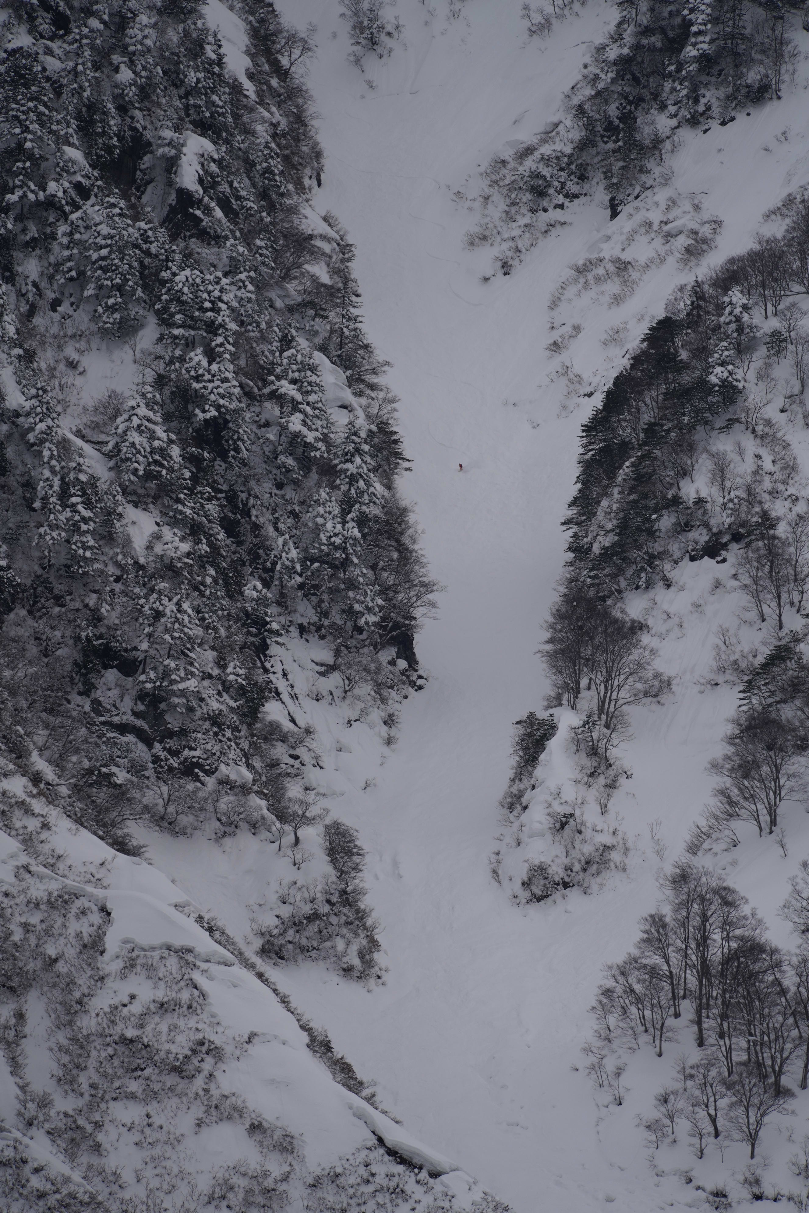予想通りではあったが、今までに経験したことがないような急斜面で一瞬にしてトップスピードになった。この日のために作った短く取り回しが良い、硬い板が僕に安心感を与えてくれた。トップスピードのまま、ターンを繰り返す。標高差約1000mを一気に滑り降りる。3分間全力で走ると、麓の安全な場所へ辿り着く頃には肩で息をするくらいだった。