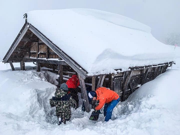 六日町八海山スキー場のロープウェーで荷揚げを行い、小屋へ寝袋や食料などを運んだ。雪に埋没した小屋を掘り起こすのはひと苦労あったが、無事に小屋の戸を開けることができた。小屋の中は広く、夜を過ごすに十分な快適さがあった。ひと通りの支度をしたところで外を見ると一瞬の美しい夕焼けが現れた。