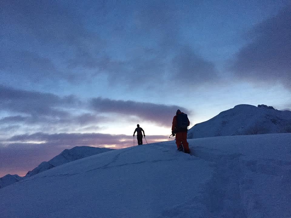 無線機の電源を入れ、麓で準備しているドローンパイロットと連絡を取る。ヘッドライトの明かりだけを頼りに目的地へと進む。雪は放射冷却で湿気が抜け、羽毛のように軽かった。夜空がだんだんと薄れて、淡いピンクの空へと変わってきた。八海山は冬の間毎日のようにいる場所だが、このような色の空や景色は見たことがなかったので、まるで初めての土地に来たかのような新鮮な気持ちになった。