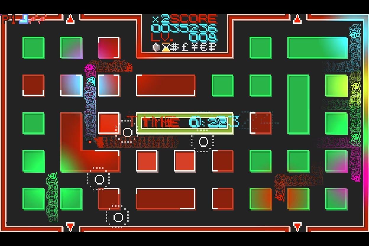 2体倒すごとにレベルと得点倍率があがり、レベルが5の倍数に到達すると穴を掘る速度がアップする。移動時にグルッと囲むように壁へ色を塗ると得点になり、ゲーム開始時に埋まっている7つのアイテムを掘り当てるとこれまた得点と、あれやこれやと点数を稼ぐ要素が劇的に増えている。5分というテンポのいいゲーム性もあって、つい「あともう1回!」と何度も遊んでしまう魅力がある。