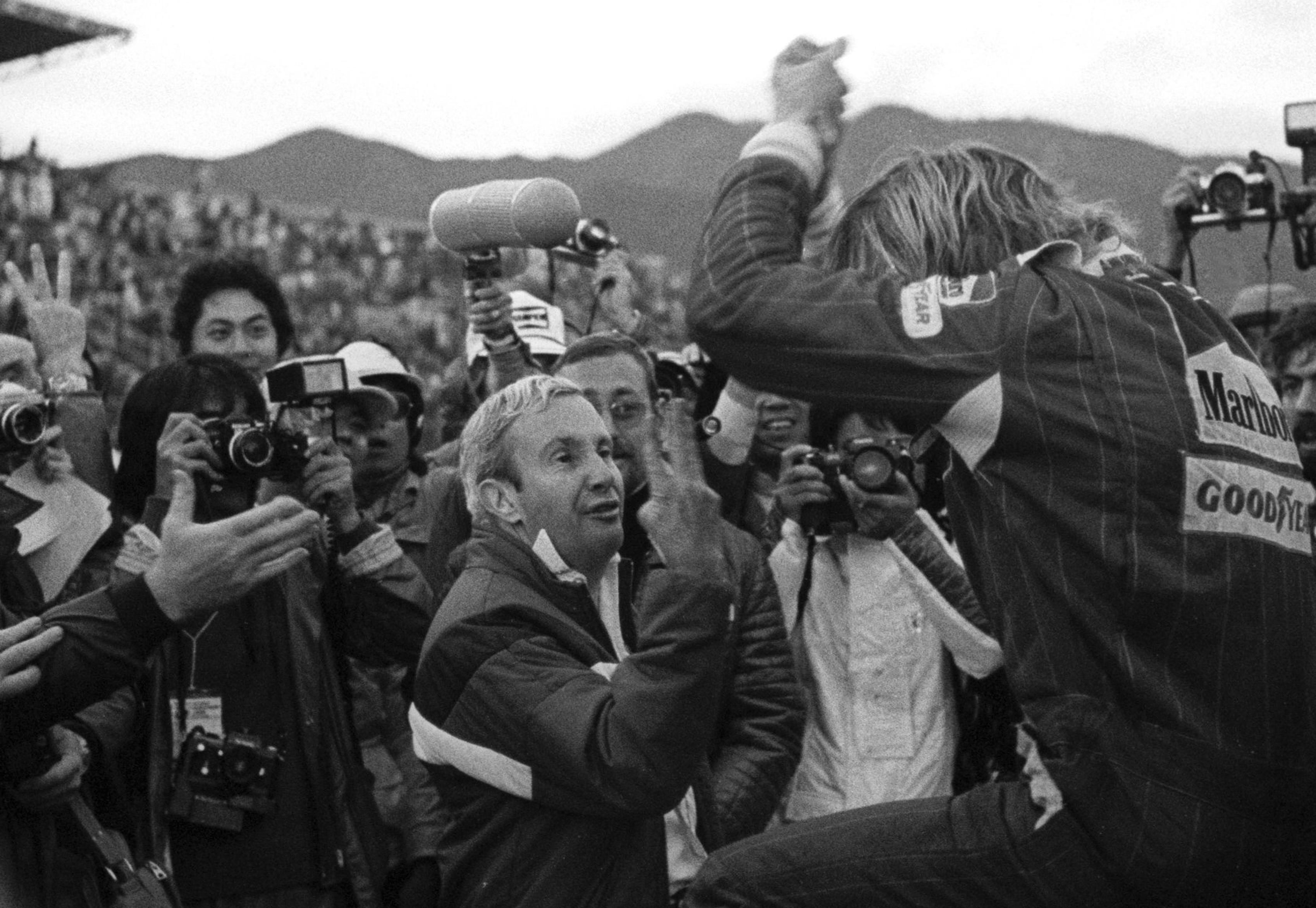 下の写真は当時のマクラーレンのボス、テディ・メイヤーが「おまえさんは3位だ。ラウダに1ポイント差でおまえさんのチャンピオンが確定したんだぞ!」と伝えたその瞬間を捉えたものだ。