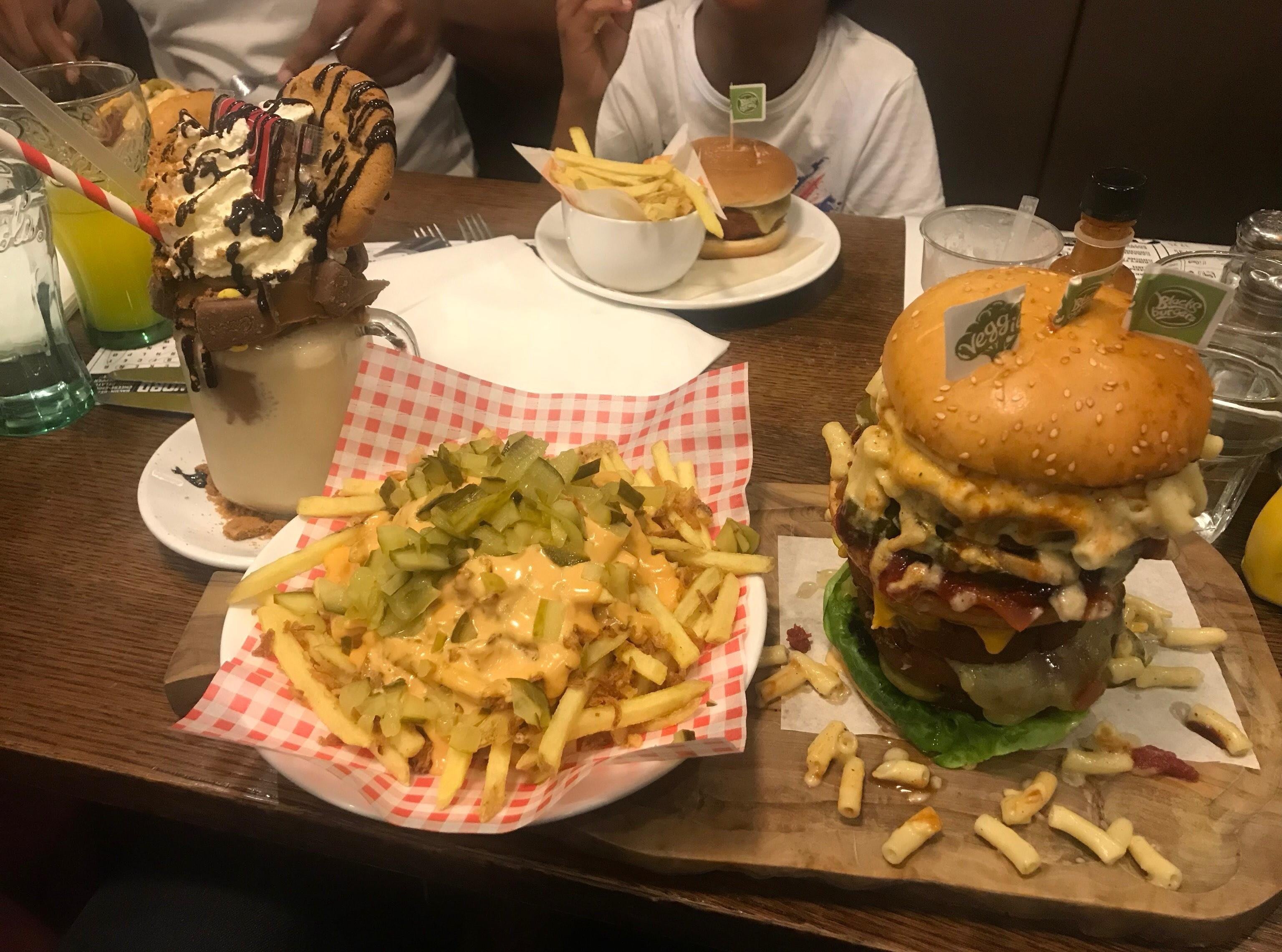 「ある日の “チャレンジ” では、パテ5枚とマカロニ&チーズを挟んだベジバーガーに特大プレートのフライドポテトとクッキーシェイクを食べたよ」