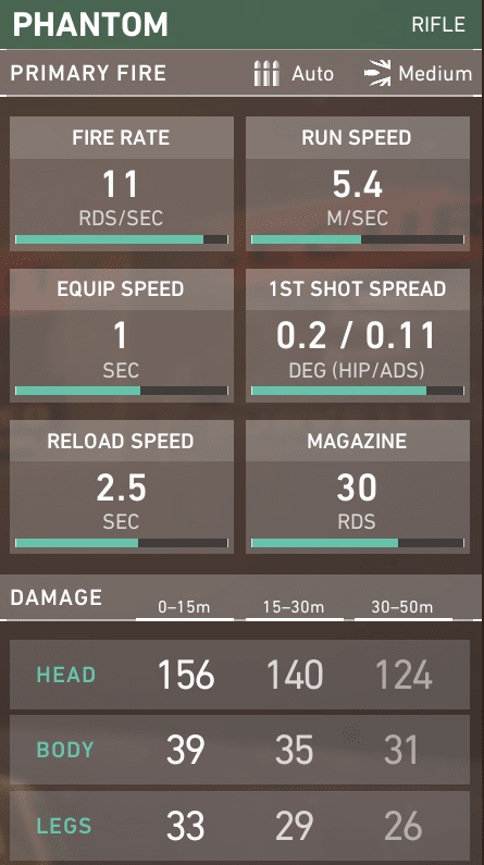 最初はダメージとレンジからだ。ライフルはすべてのレンジ(距離)で優秀だが、30〜50mと50m超で特に優秀だ。プレイをしていれば、この2項目が《ファントム》と《ヴァンダル》の大きな違いであることに気が付くだろう。《ヴァンダル》はすべての距離で同じ量のダメージを与えることができるが、《ファントム》は違う。