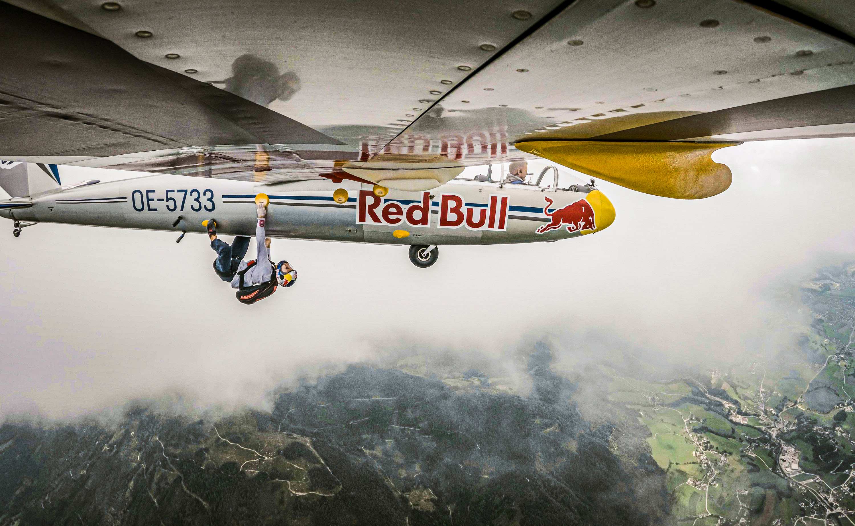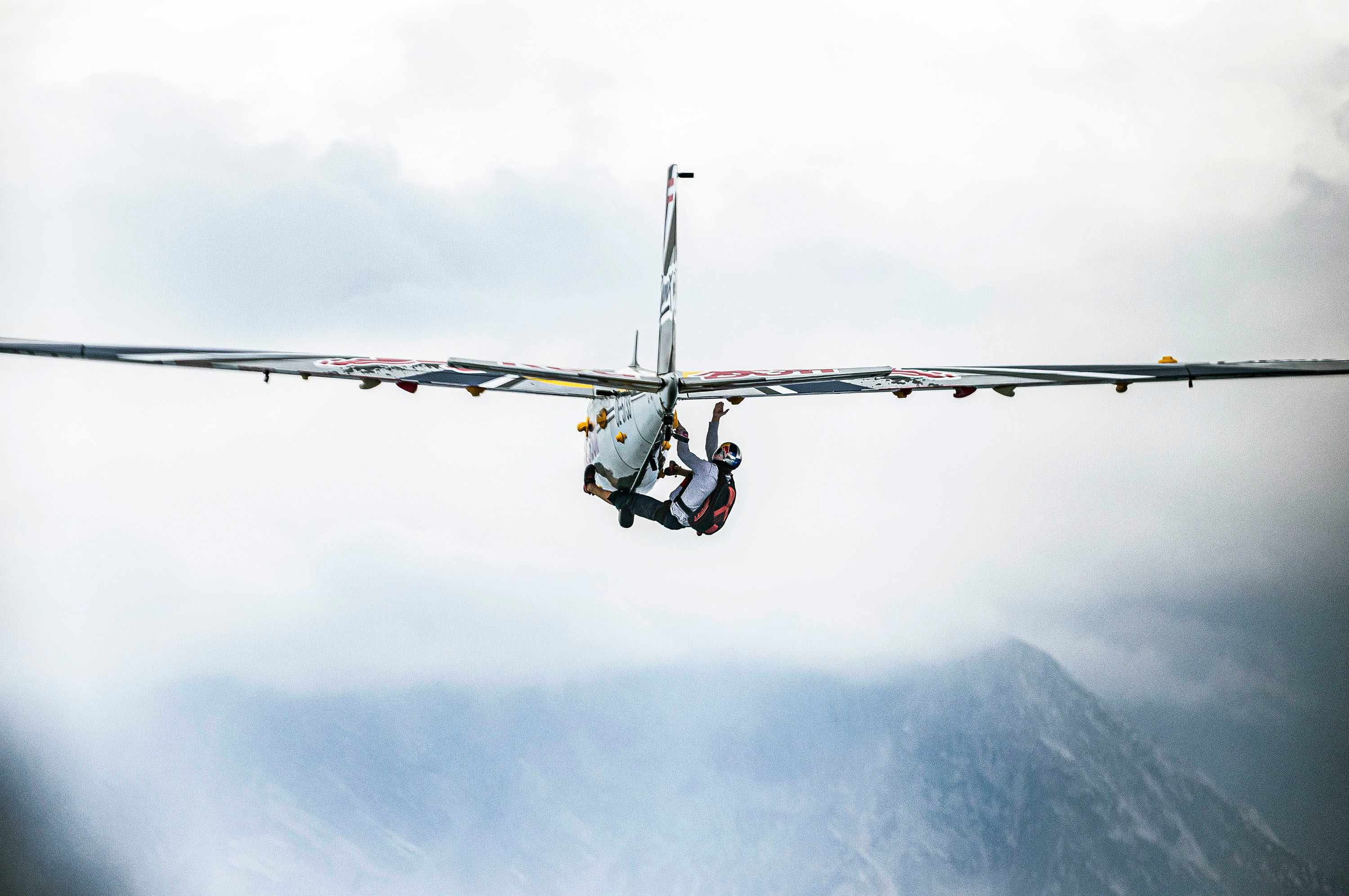 この複座グライダーが理想的な高度に到達すると、パラシュートを背面に装備したスコフィッチはキャノピーを開いて機外に出て、グライダーの裏面に沿って進む奇想天外な登攀に向けて準備を整えた。