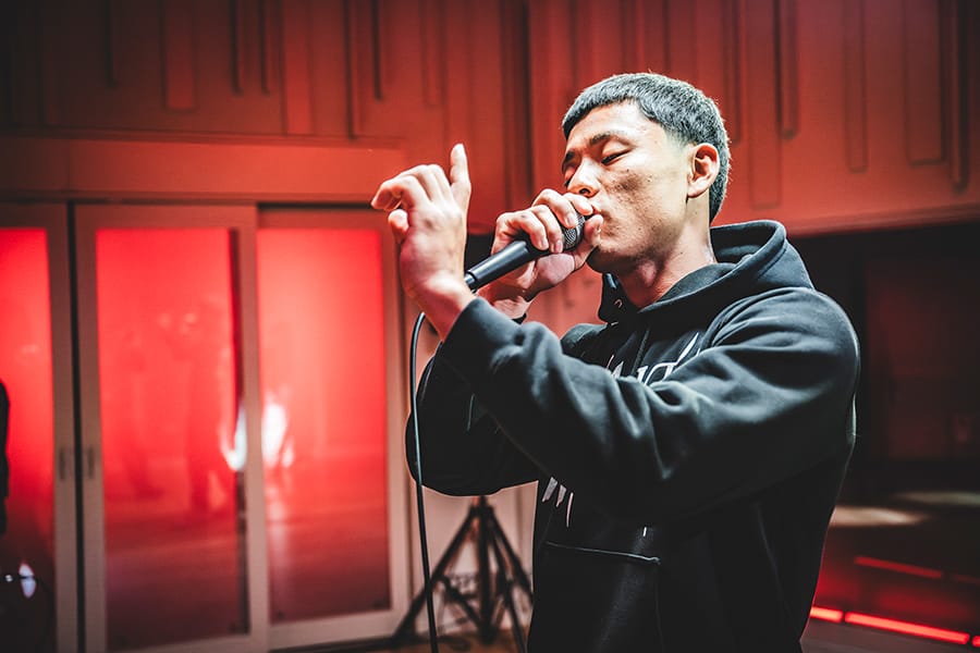 今日、朝ここに来る途中の新幹線でリリックを書きました。パフォーマンスも思ったよりやりやすかったっす。自分が順番がラストだったんで、リリックもちゃんと締めっぽい感じで書いたかな。