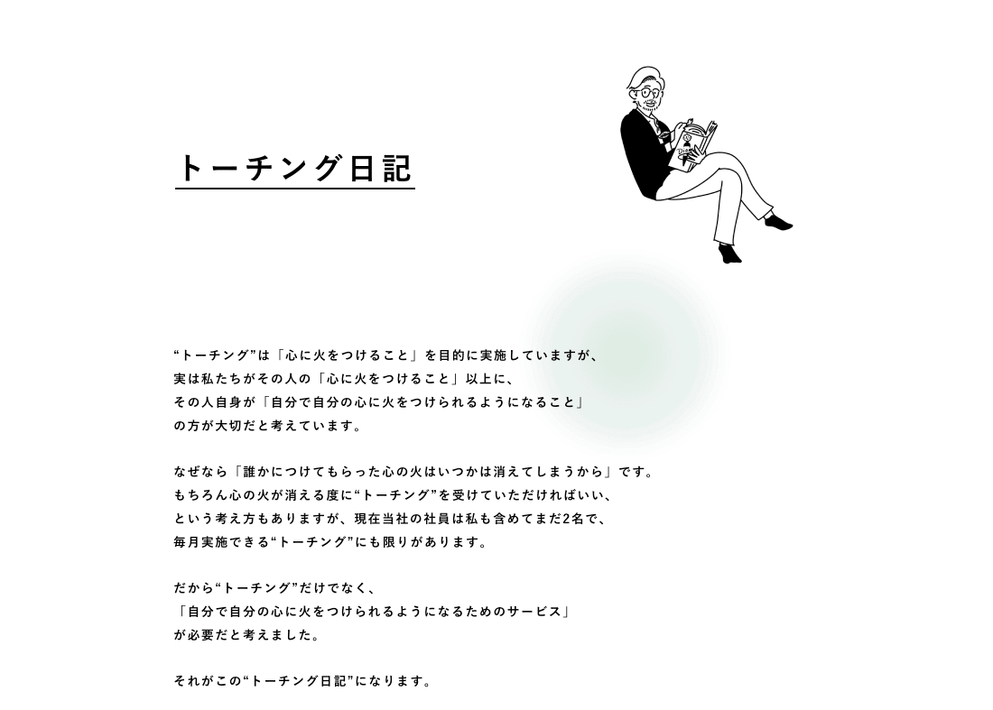 つまりトーチングにおいて実際にお客様にお伝えしたアドバイスや考え方かた、具体的な方法論といった"心に火がつくメカニズム"を、誰もが自分のものとして使えるようにエッセンスを抽出して、永久保存版として纏めた秘伝の日記です。