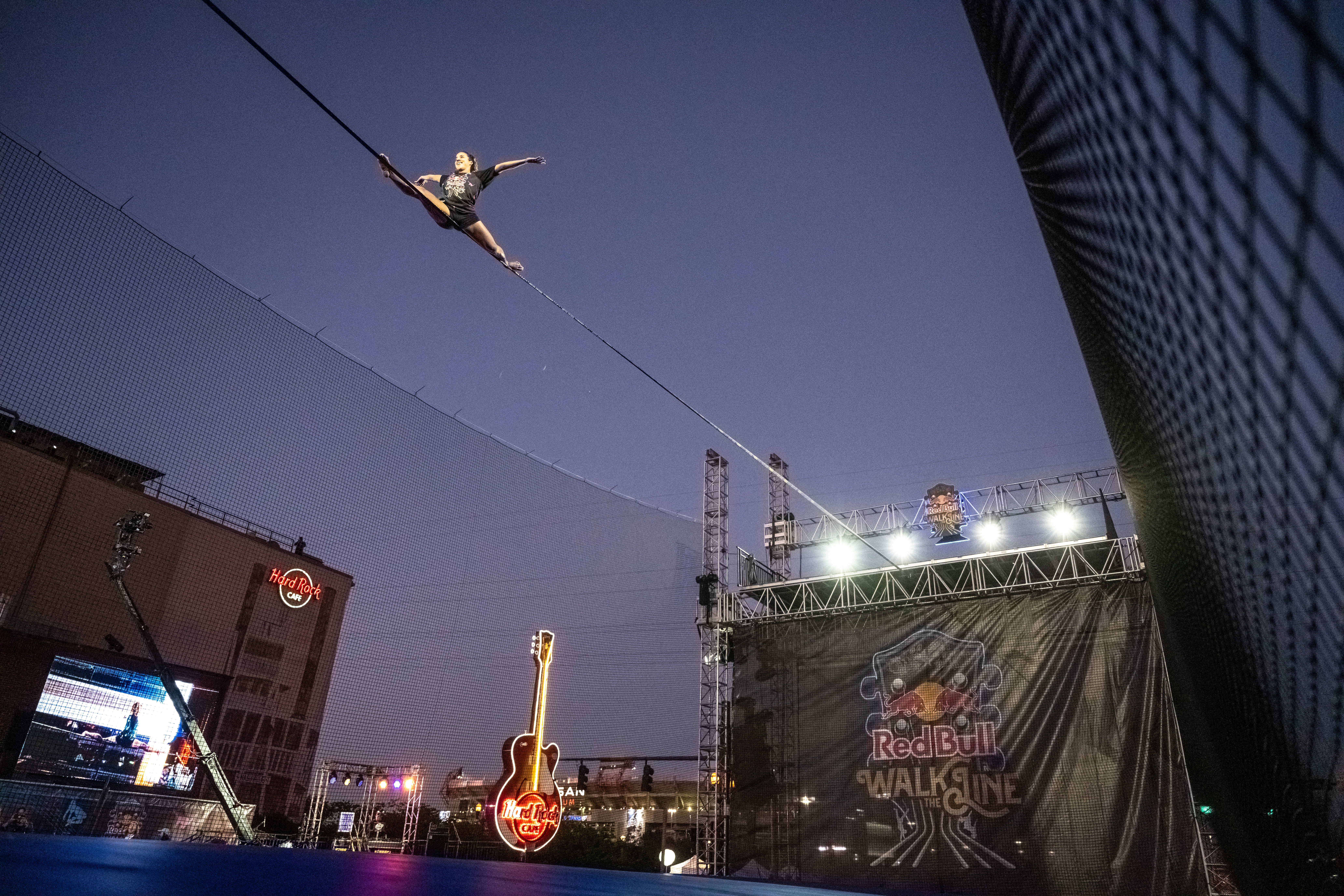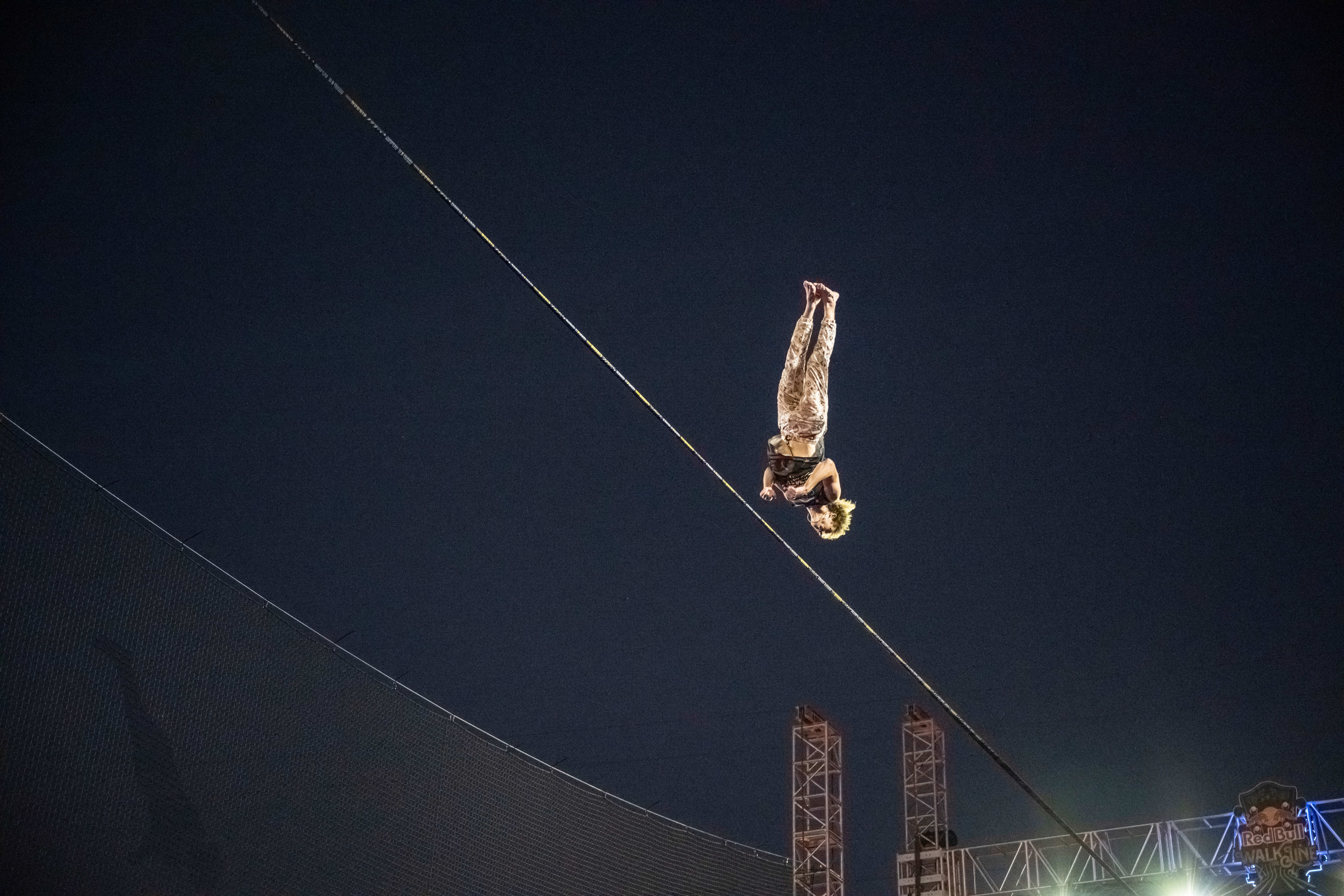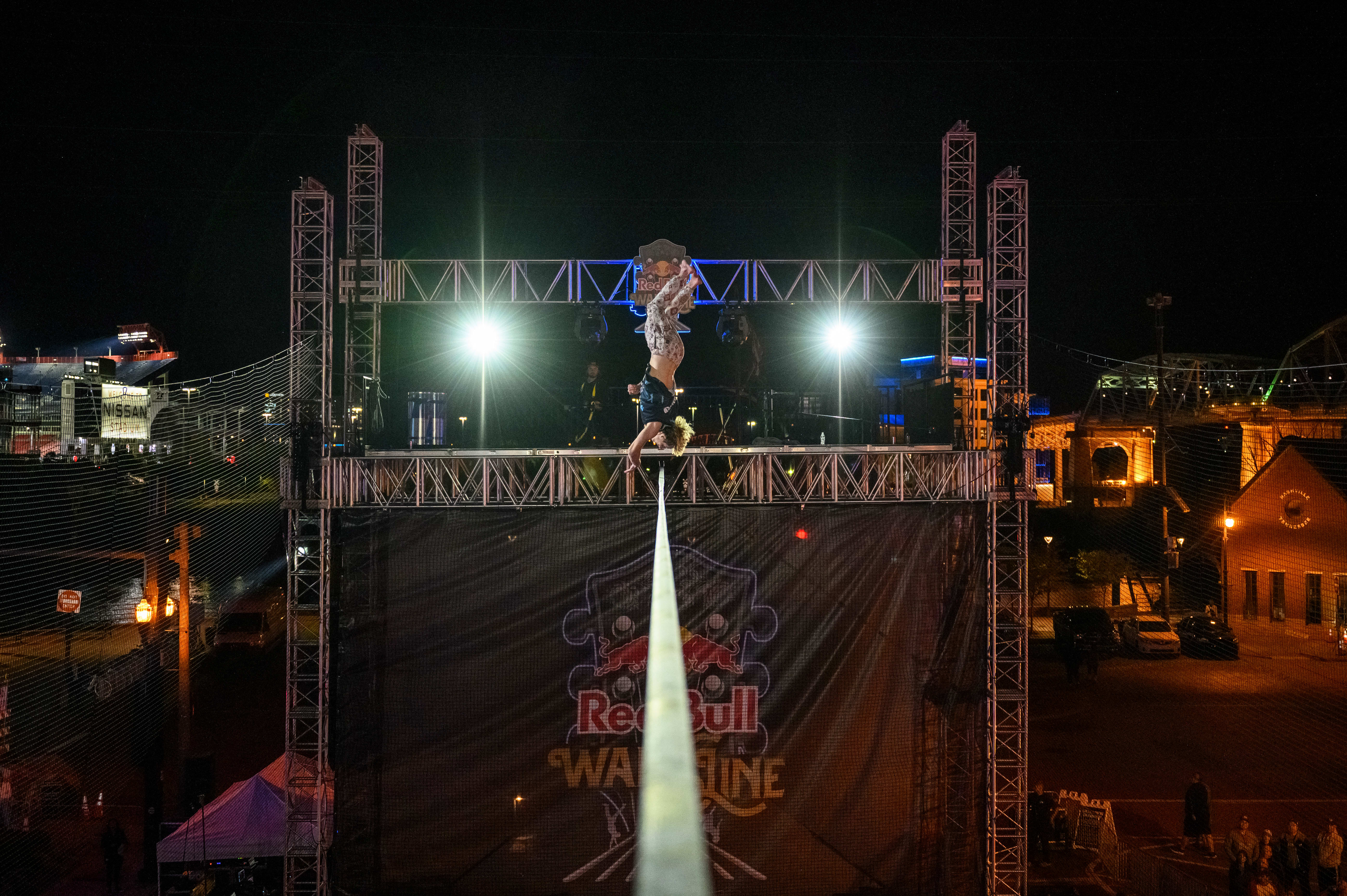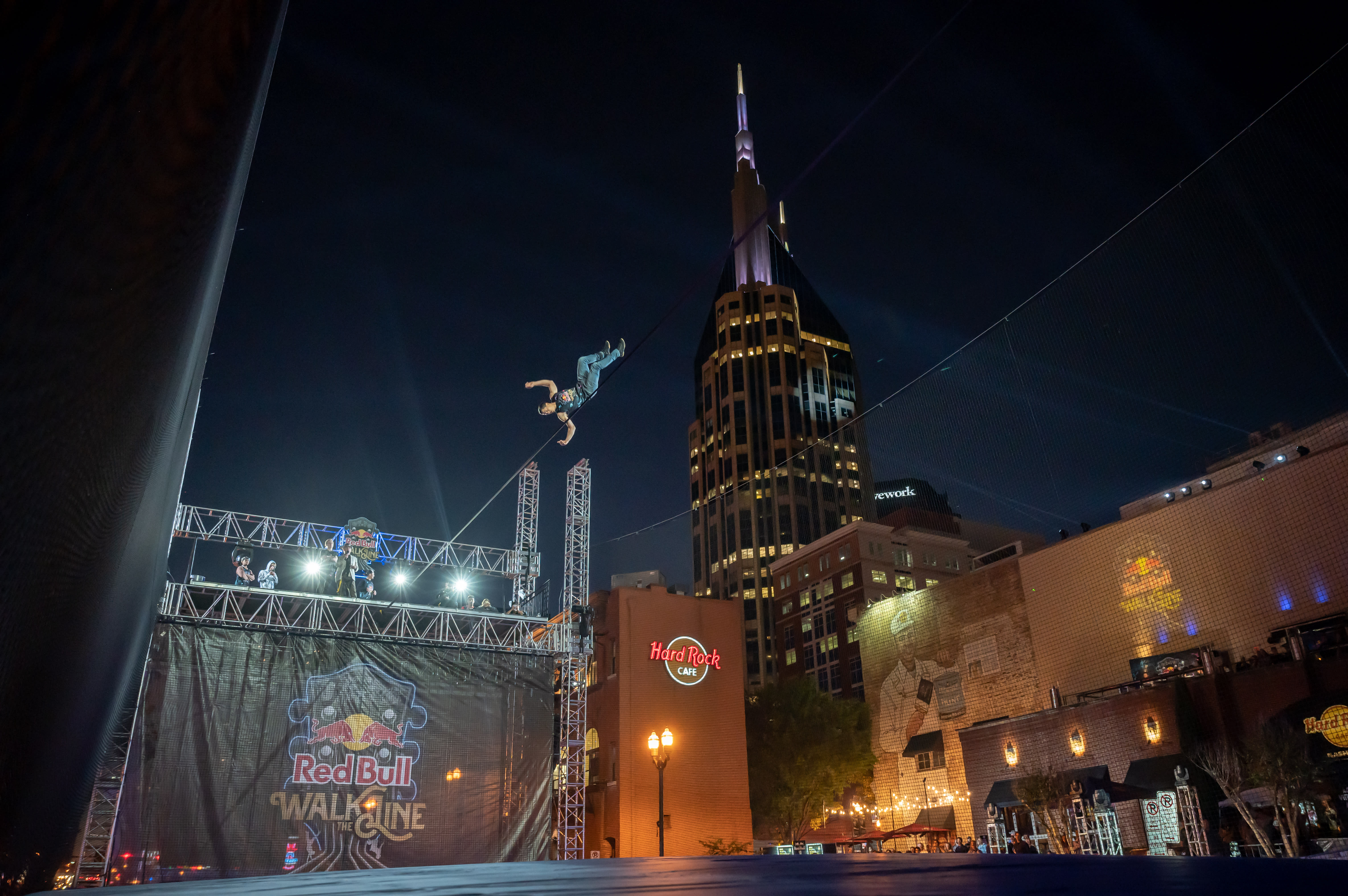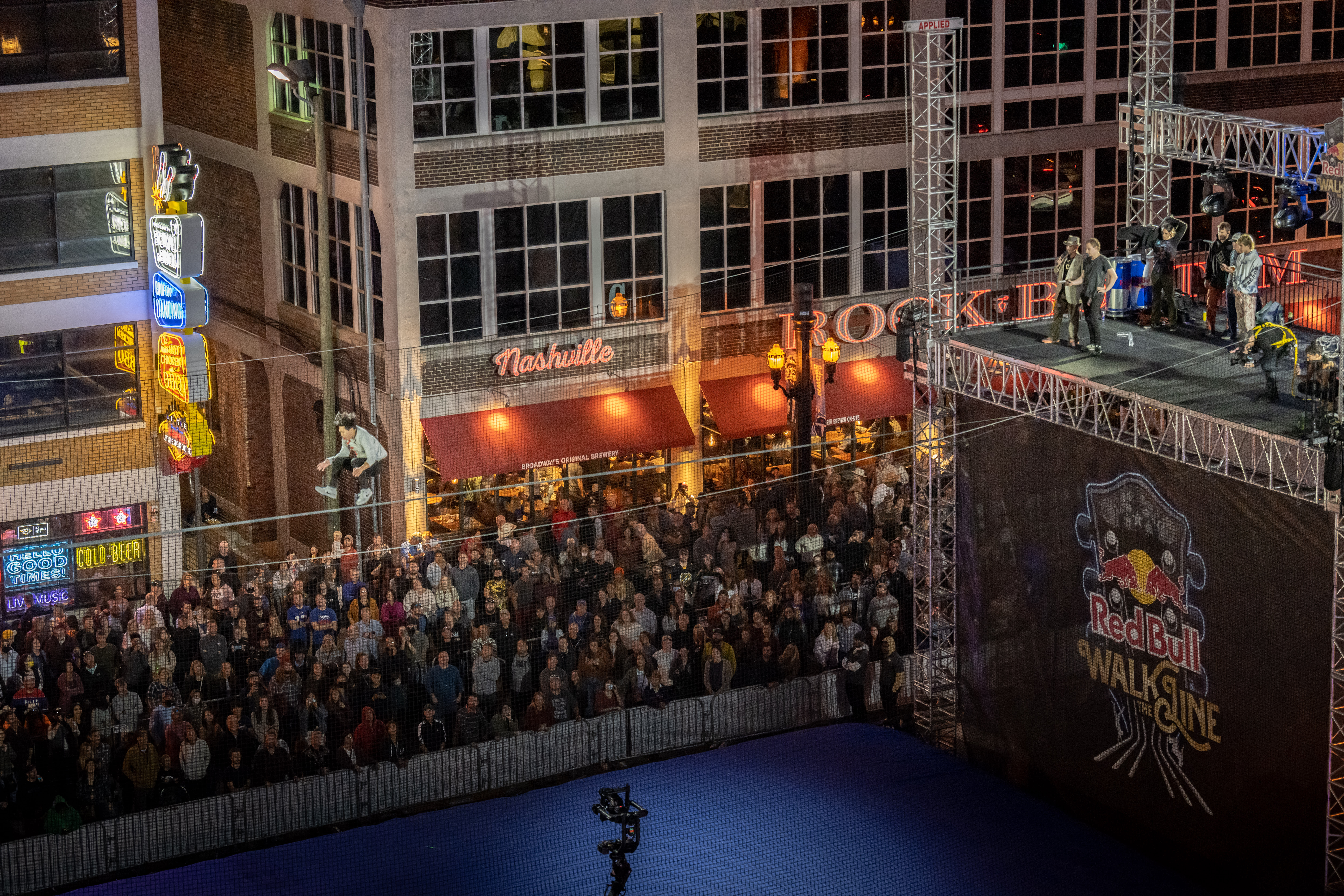 このようなテクノロジーを駆使しているドノバンは、2021年10月16日にテネシー州ナッシュビル中心部の歴史的なストリート、ロウワーブロードウェイを訪れ、約9mの高さに張られたスラックラインで実力を競い合うフリースタイル・スラックラインイベント【Red Bull Walk The Line】で撮影を担当した。