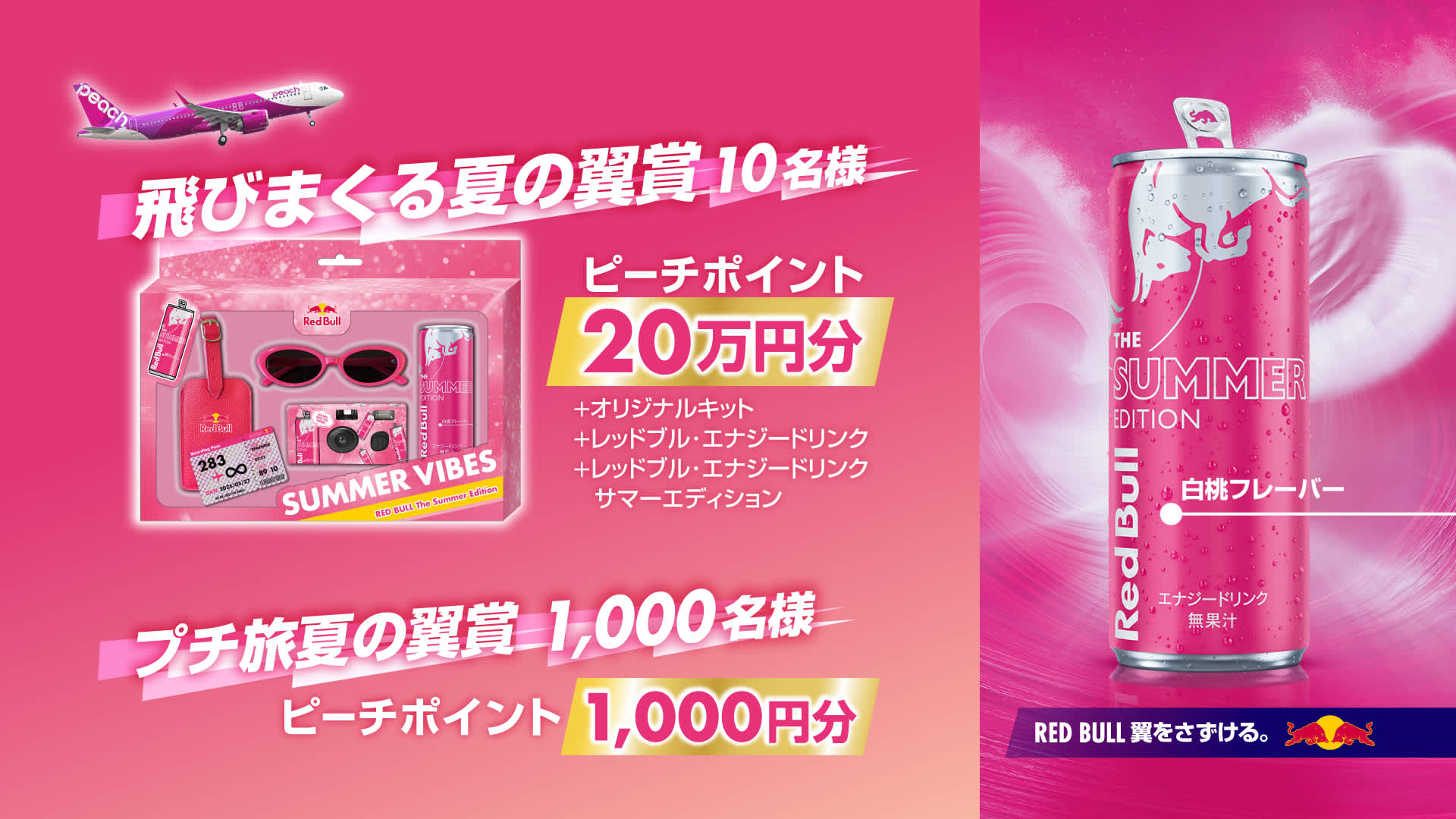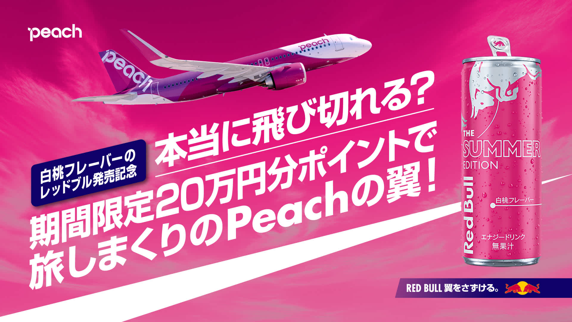 「⽩桃フレーバーのレッドブル発売記念!本当に⾶び切れる?期間限定20万円分ポイントで旅しまくりのPeachの翼!」キャンペーン