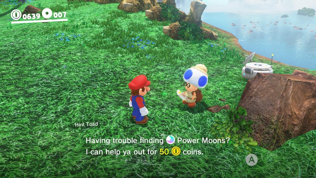 しばらくプレイを続けていると、残りのパワームーンを求めて当てもなく彷徨っている自分に気付くはずだ。そんな時に助けてくれるのがヒントキノピオやヒント鳥だ。たとえば、ヒント鳥に話しかければ、パワームーンの位置が分かるヒントを教えてくれる。