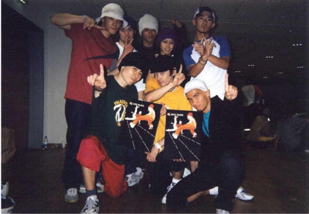 「若手メンバーとして新たにHideki、Bobchancynを加えたメンバーでUK B-boy Champonshipの関東予選にて優勝した時の写真。この頃からメンバーも若返り、関東だけでなく関西のバトルにも挑戦しはじめました。初期のメンバーと新しいメンバーが常に化学反応を起こし続けることこそが、WASEDA BREAKERSの強み。」(Tobacco)