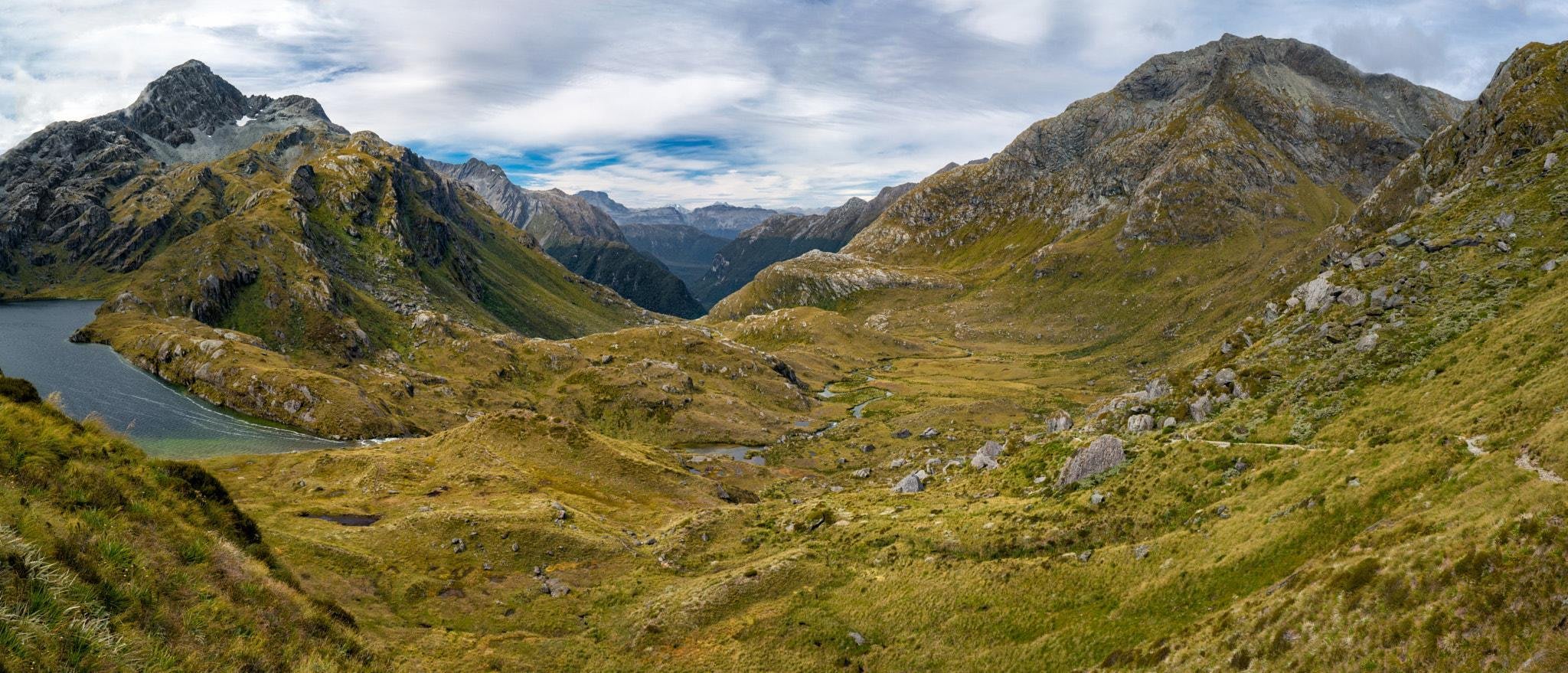 ミルフォード・トラックは川沿いに進み、湖を巡りながらマッキンノン峠を登る。この峠からは、南島の山々とフィヨルドランド国立公園が一望できる。