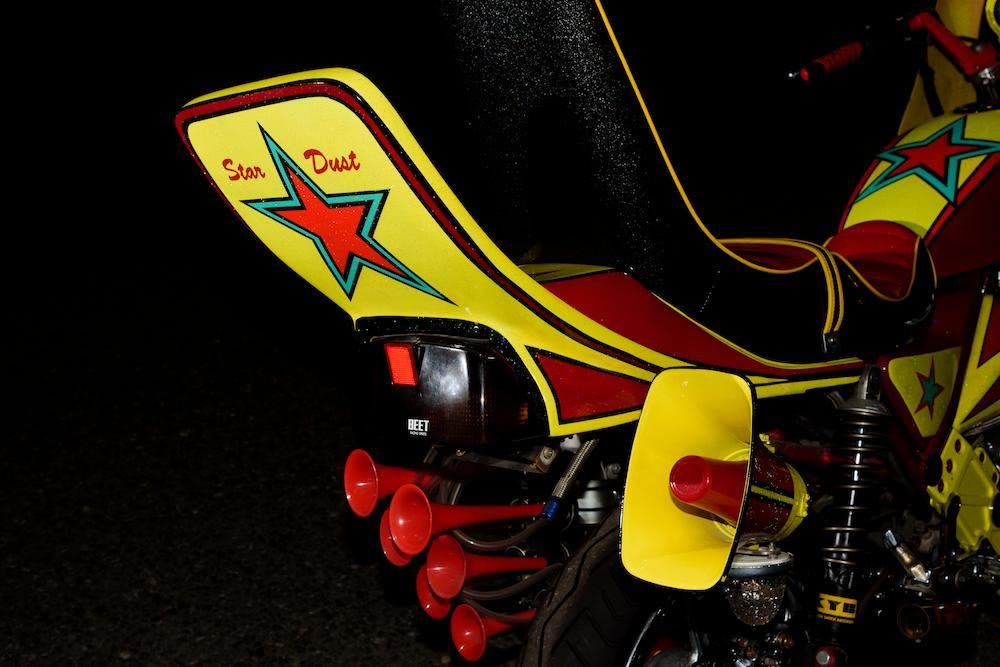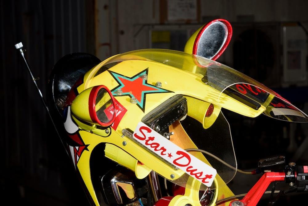 ひと口にジョーズ顔といっても、そのスタイルは様々で、このバイクの場合は、イエローの下地にレッドのバクハツマークを入れ、そこにジョーズ顔を組み合わせている。また、ロケットカウル下部、タンク、テール裏に星がマーキングされているが、これはオーナーが所属している「スターダスト」のチーム名を表した証である。
