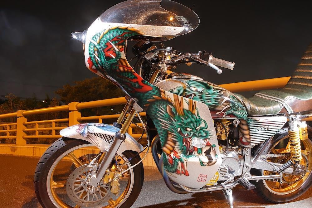 まさに「和」のカスタムペイントを施したこのバイクは、スズキGS400をベースにしている。ロケットカウルには天高く舞い上がる龍を描き、その姿は和彫りの入れ墨師がバイクにあてたかのような姿を見せる。書き下ろされた龍は、車体全体を使って流れるように描かれる。BEET製のアルフィンカバーとテールに連なるように1頭の龍が収まる。