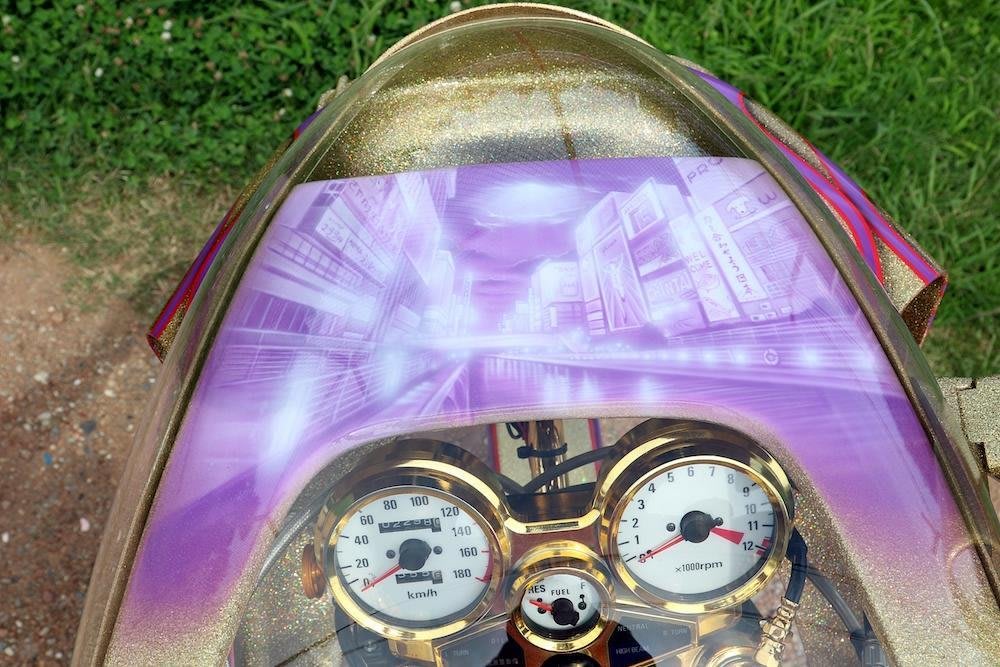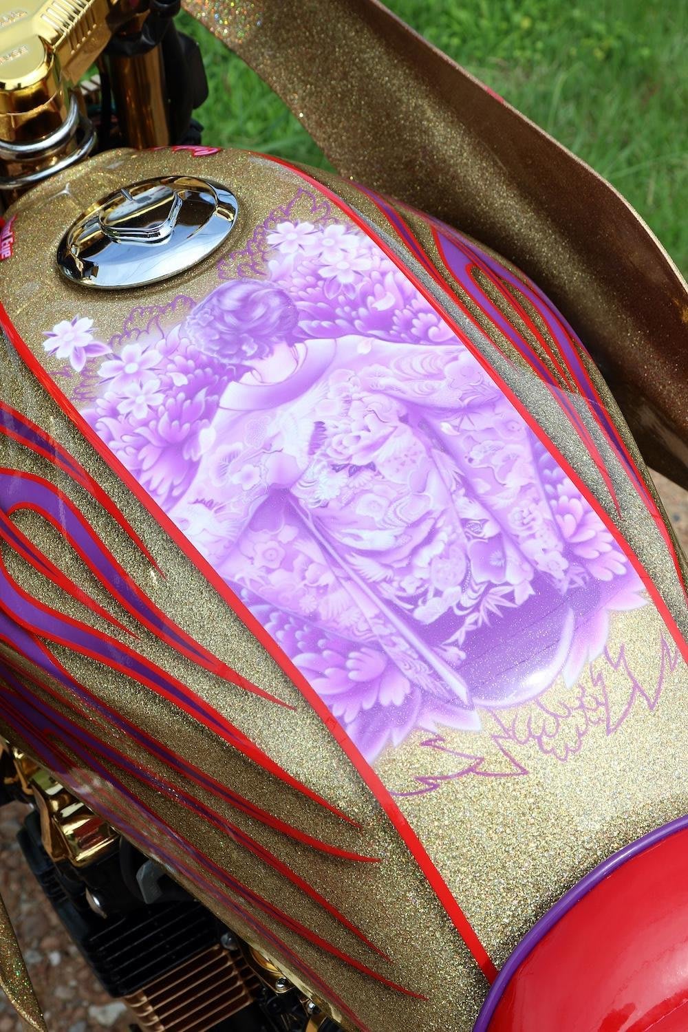 さらに、ロケットカウル上部に、オーナーの出身地である大阪の街並み、そしてタンク上部に自らをモチーフにした着物姿の女性を描く等、このうえないアート感覚に満ち溢れた1台として仕上がっている。この単車は、まさに最高のカスタムであり、旧車會における芸術、アートな日本の伝統文化を表現する極みといっても良いだろう。