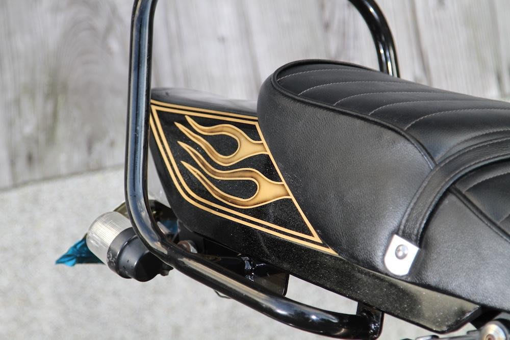 それ以外ではBEET製エンジンカバー、エンデュランスマフラー、キャブカバーといったパーツを装着するが、一番アート感を引き出しているポイントは、やはり、いさぎよく、そして勢いよく入れられたゴールドフレアだろう。迫力、存在感、威圧感を高める要素となっている。