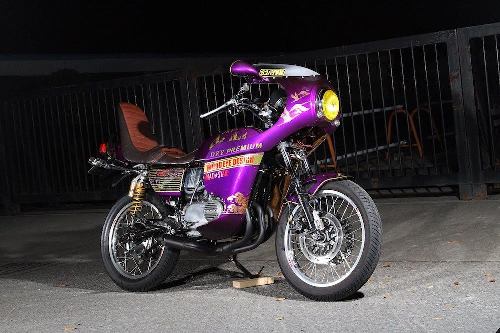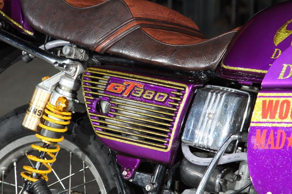 このGT380は当時のレトロバイクを、旧車會ならではのセンスによってリメイクしたもの。当時流行ったイノウエ製の三分割ロケットカウルを装着し、全体をムラサキで統一。そこにゴールドのロゴマークとラインを引く。遊び心という面では、ヘッドライトの横に羽ばたく鶴を配置し、テールに海波を入れ、浮世絵風の画風によってワンポイントで目立つ工夫を施す。全面画にするのではなく、あくまでもポイントメイクにしているあたりが玄人の仕上げと言えるだろう。