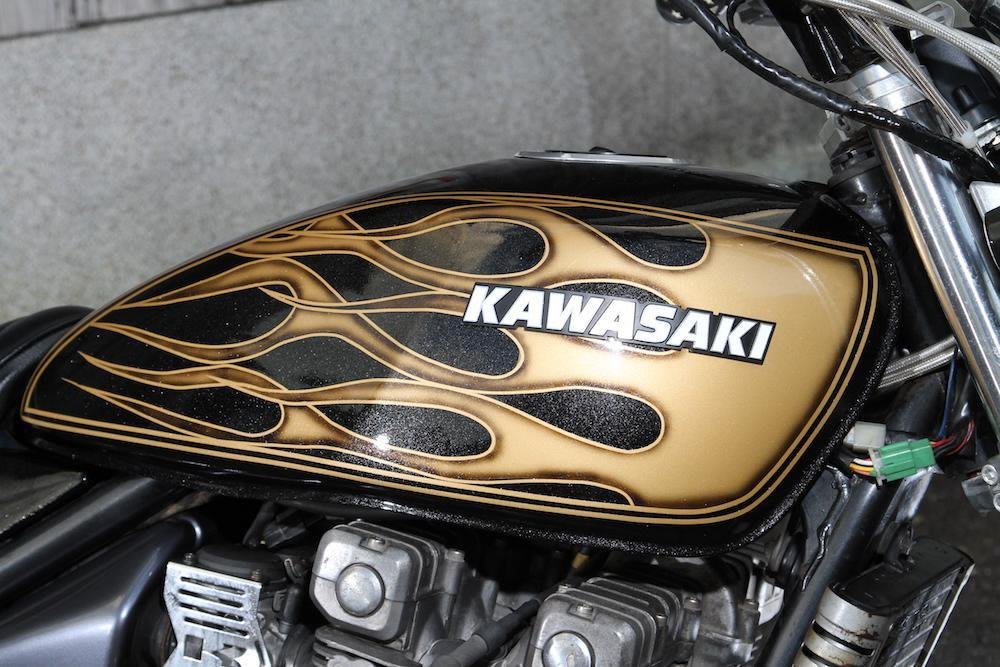 このゼファーのイジリ方は、先にも述べた通り、全体的にシンプルなアプローチだが、押さえるべきポイントを絞り込むことで、結果として硬派を主張する雰囲気を醸し出す。このバイクの場合は、ゴールドとブラックのみのコーディネイトで、タンクとテールにスピードを表現するフレアパターンを入れる演出を施す。