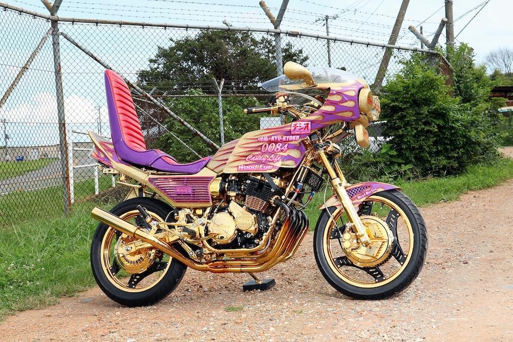 黄金に輝くこの単車は、ホンダCBX400Fである。そのスタイルは旧車會カスタムとして王道だが、仕上げ方が特殊。エンジン、フレーム、ホイール、フロントフォーク、スイングアーム、ハンドル、マフラーにいたるまで、すべてのパーツが黄金に輝く金メッキ処理を施している。装着している外装パーツもゴールドベースに7色金ラメを使い、そこに紫に赤い縁を入れたフレアーを大胆に描く。